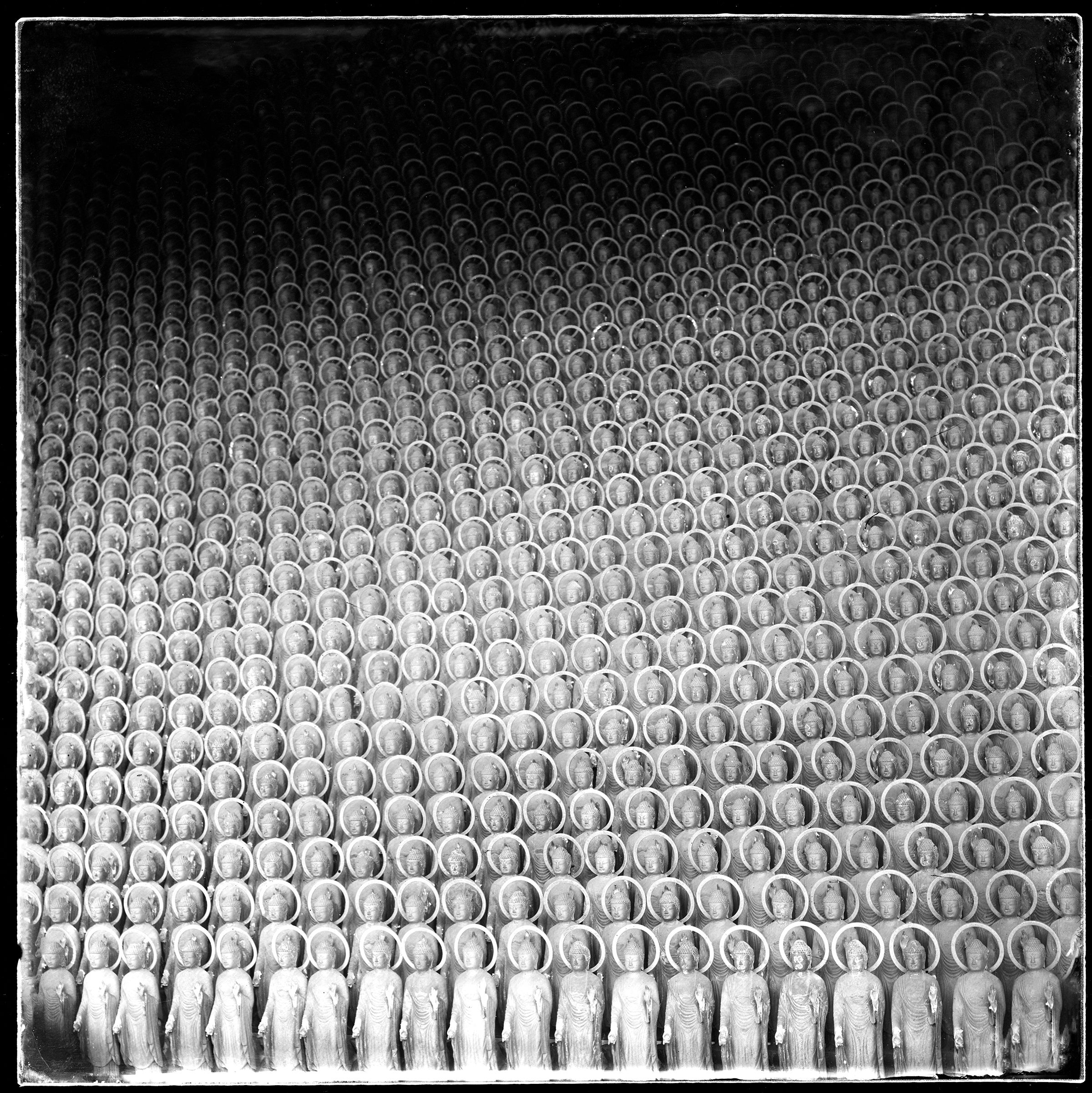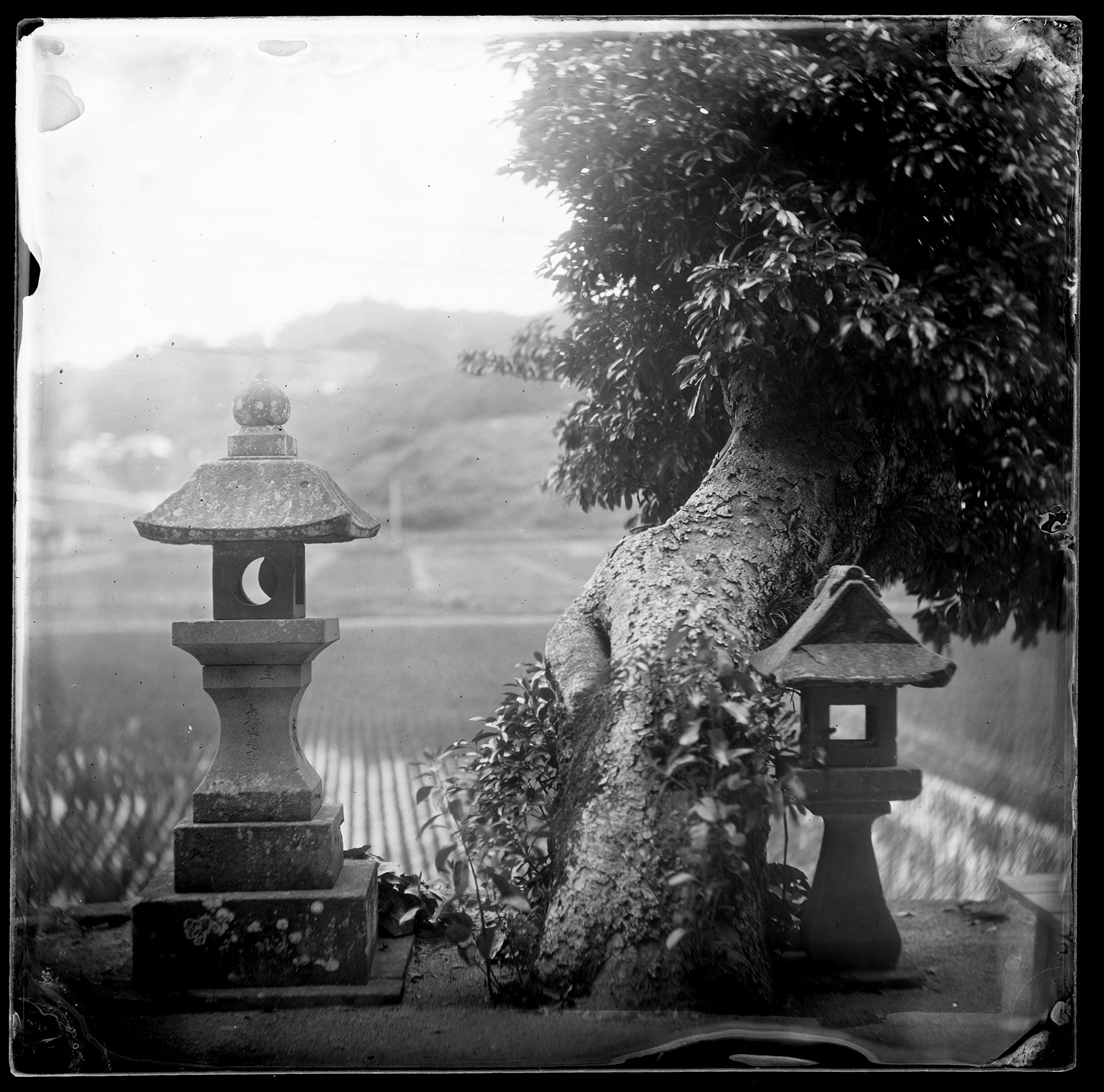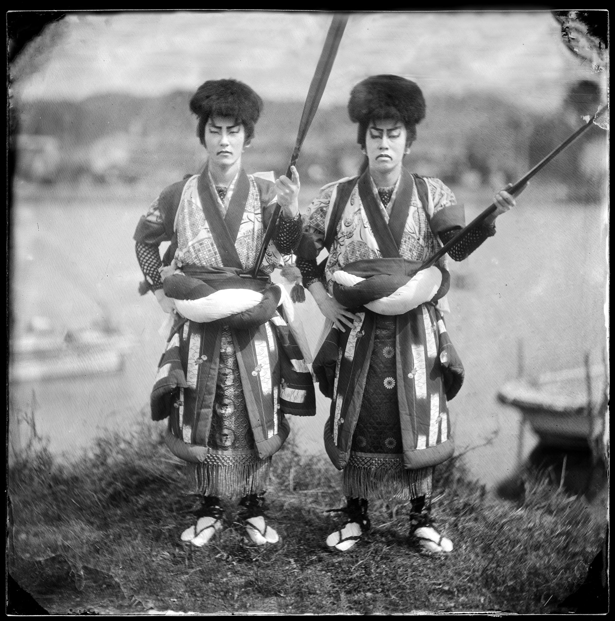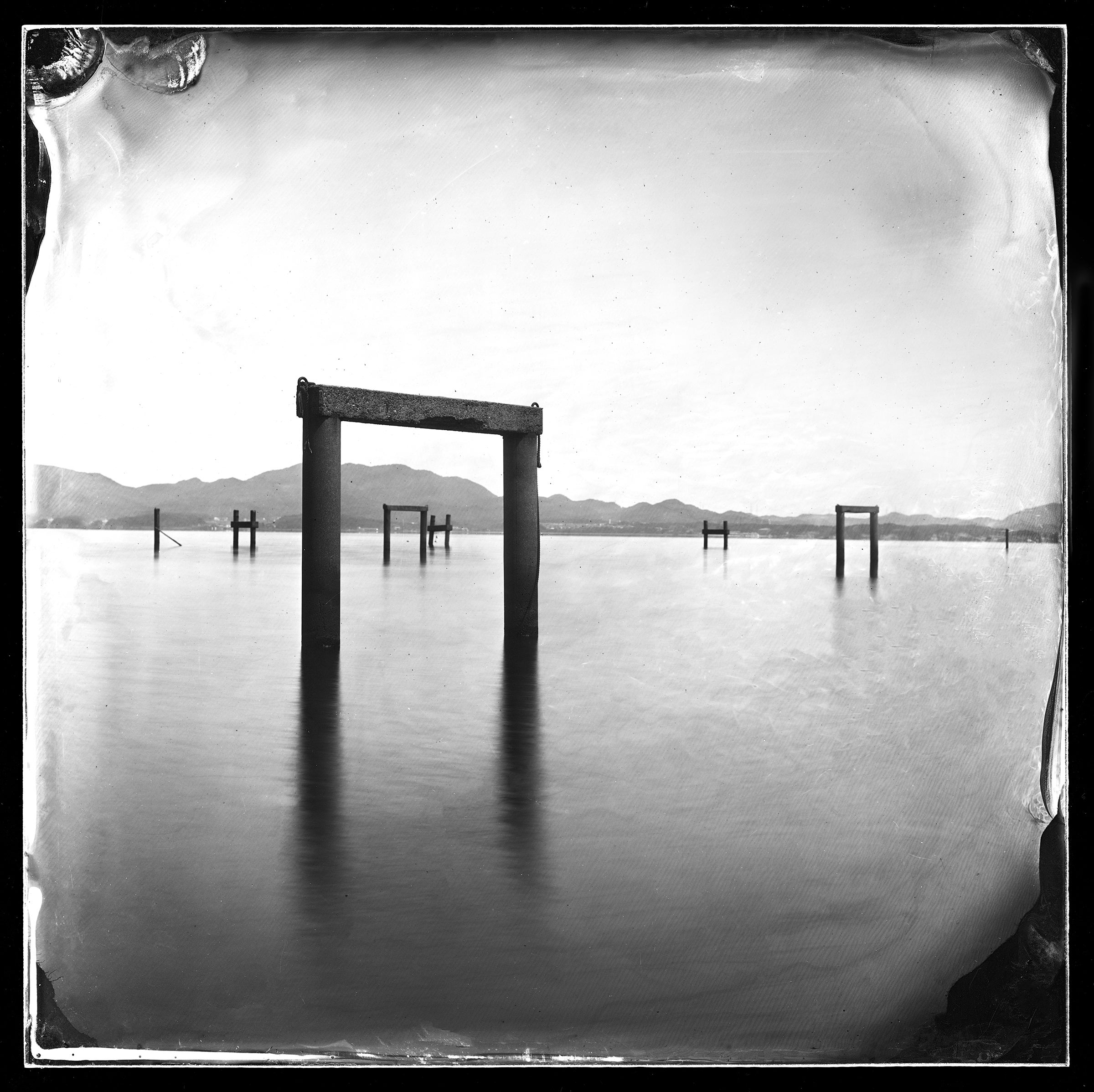 この古典的な写真の技法は「湿板光画」と呼ばれ、幕末のころによく使われました。手間暇がかかる作業で、ネガ一枚を作るのに20分を要します。露出機は使えないし、一日、わずか数点の作品が出来れば嬉しいのです。 一枚、一枚の出来上がったネガは焼き物の窯変のように不思議な模様があり、また、いつの時代の情景なのか時代交錯するのが魅力的です。