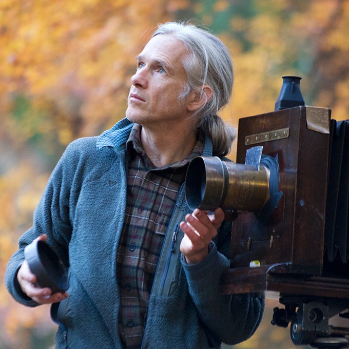 大きな湿板写真機で撮影に挑むエバレットさん