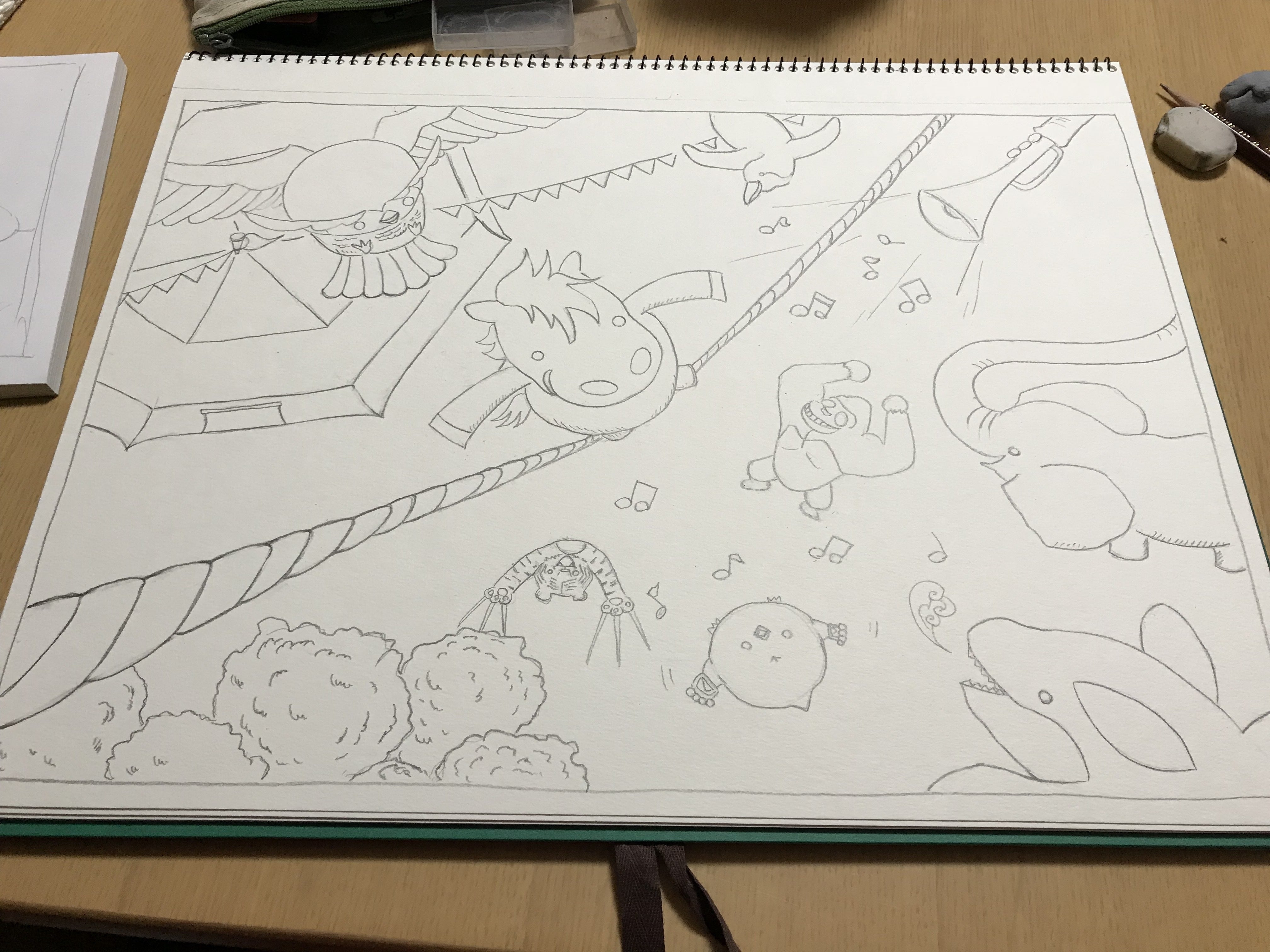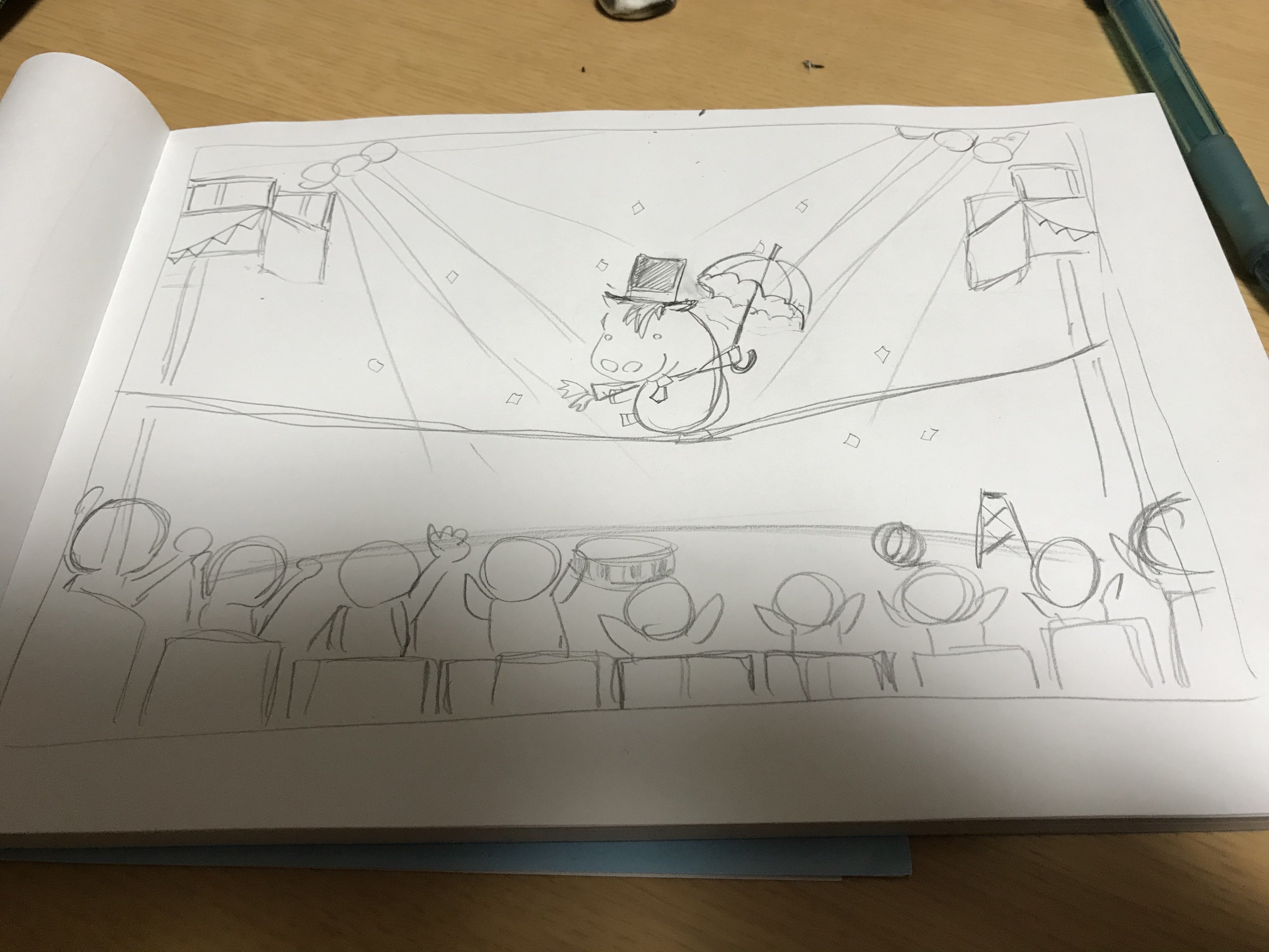 こんにちは!【tabi maruco】大橋です!!ちょっと日にちを開けてしまいました。こういった気の緩みがいけませんね。さあ『たびマルコ』の制作過程もvol.11となりなりました!勝手に1とか2とか分けて書いているので、僕のさじ加減ですが(笑)そんな今回はこちらです!ラストの1ページ前。マルコくんが綱渡りの才能に目覚めるところですね。ここはけっこう構図に凝ってみました。綱の遠近感とか、素人にしてはかなり頑張ったと思います。空高く上がって、綱に乗った。そして他の動物たちが喜んでいるというのを書こうと思ったら、このパターンと、逆に下から見上げるパターンを考えていました。しかし、下から見上げてるとマルコくんの顔が上手く見えるように描けないかなと思いました。なので上から見たようにしたのですが、上から見ると、馬の口って案外見えなかったりします。こちらリアルマルコあまり口が見えませんね。でもこのシーンのマルコくんには笑って欲しかったです。そこでもうこれは無理やり口をニヤリにさせました!実際にはありえないほどのニヤリ具合ですが、これは絵本なのでOKですよね!!こうして完成したこのページ!この辺りで、動物のバリエーションたくさん作ったつもりだったのに、モノトーンかぶりしてる!!ということに気がつきました。白黒で描いているときは気がつかなかった!!パンダゴリラがサーカスの入り口から入れないだろ、などとは言わないでくださいね!それではまた次回です!!たくさんのご支援ありがとうございます!!期日いっぱい頑張っていきます!!