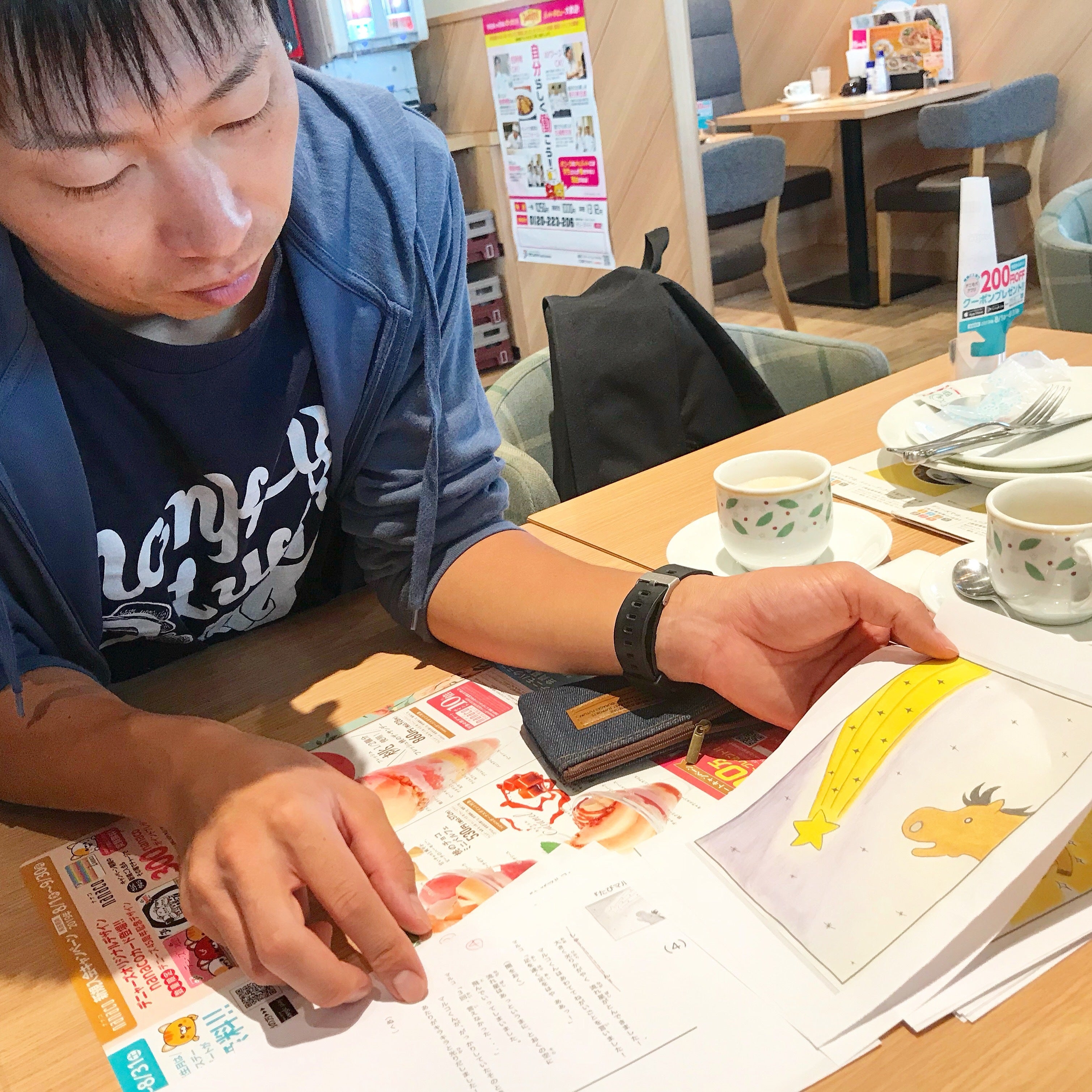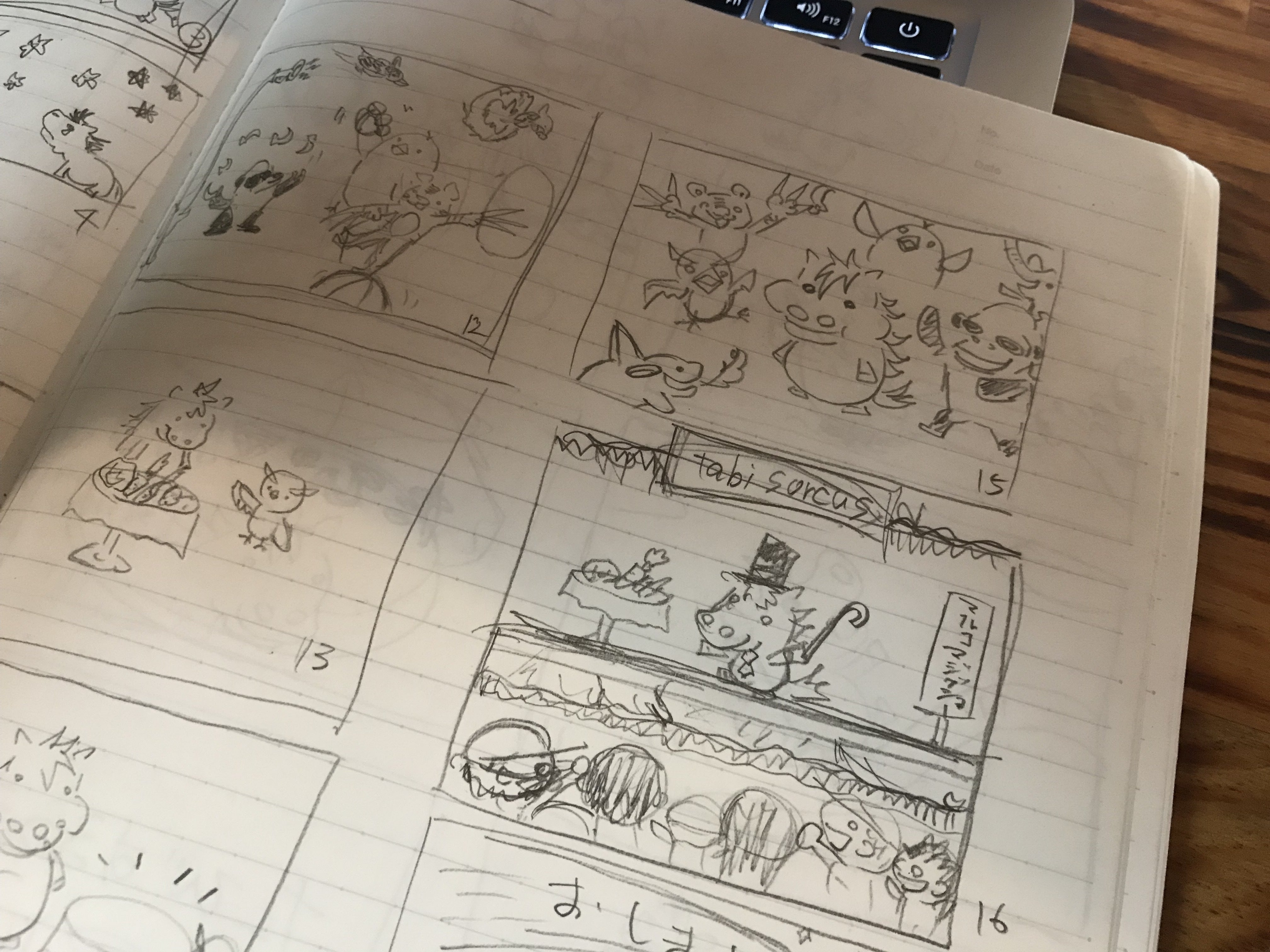 こんにちは!【tabi maruco】大橋です!ここでは大橋ですと名乗っていますが、自己紹介にありますように、普段ブログやSNSでは、うまたうろすと名乗っています。名刺にも書いちゃってます(笑)さてさて!本日も『たびマルコ』の制作過程について書いていこうと思っているんですが、【tabi maruco】ノートを見ていたら、そういえばそうだったなというものを発見しました。これは『たびするうまマルコ』の後に、物語をやっぱり変えたい!となって『たびマルコ』を描くまでの間の時に描いていた設計図。ラストシーンのアイデアの最初のやつですね。マルコくんが見出す才能が、綱渡りではなく、これは早食いです(笑)最初マルコくんは食いしん坊なあまり、早食いが特技で、まるで手品のようにあっという間に目の前の食べ物を食べてしまう。というものでした。タネも仕掛けもありません。食べているだけなので。なので最後はマルコくんのマジックショー!で終わります。こんなお話を考えていたのでした。話し合った結果、いや、これじゃ微妙でしょ。うん!確かに!ということでまた違うアイデアを探したのでした!ほんと素人ですみません!!!!素人だからこその全力で取り組んでおりますので今後ともよろしくお願いいたします!