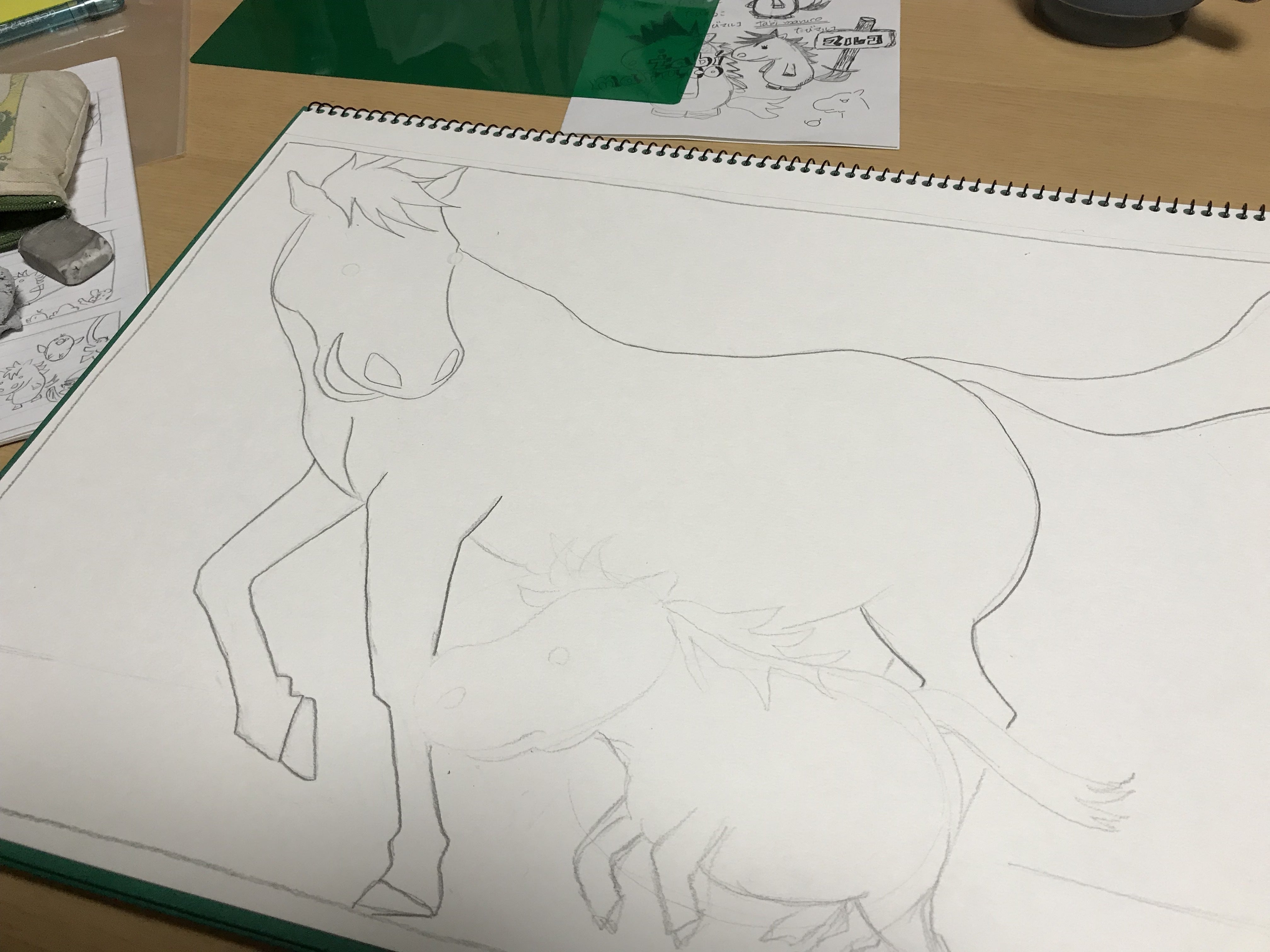 こんにちは!【tabi maruco】大橋です!プロジェクトが達成して、ネクストゴール150%に向けて進んでおります!そういえば、僕は自分のブログと並行して、乗馬クラブのブログも書いています。▼Gocooうま日記https://ameblo.jp/gocoo-horse-village/乗馬クラブの日常。のほほんとした内容と、撮影やイベントなど参戦する予定などを書き綴っていますので、よかったら見てみてください!さてさて!『たびマルコ』の制作過程を!1枚1枚丁寧に仕上げていきます!基本的に僕たちはこういう作品を作るということに関して本当に素人なので、プロの方々の作品に取り組む姿勢よりももっともっともっとこの作品を大好きになって、一生懸命やらねばなりません!(プロの方の取り組む姿勢は凄すぎると思うので、僕らではそれでも届かないだろうから、という意味です)1枚目完成!の時ですね。こんな感じに、1枚出来上がっていくごとに歓喜しながら進めていきました!1枚描くのに結構な時間がかかっているので、愛着も湧きます。そしてmimimikoさんの色ぬりが終わったら、次の色ぬりにすぐに行けるように、鉛筆の絵はどんどん描いていきます!どこでも描いていました(笑)これは乗馬クラブのクラブハウス。営業終了後に夜ここはアトリエ化していました。モップみたいなのが、犬のロミちゃん。下の猫がくみちゃんです。プロジェクトが達成して、まずは絵本になれることが決定しましたので、1枚目の構想に取り掛からなければなりませんね!紙芝居の1枚目は、そのまま読んでしまいますが、絵本になったら、それが表紙にくるので、1枚目が足りなくなるからです!もちろんその様子もここで書いていきたいと思いますので、お楽しみに!それでは、150%達成に向けて、応援をよろしくお願いいたします!