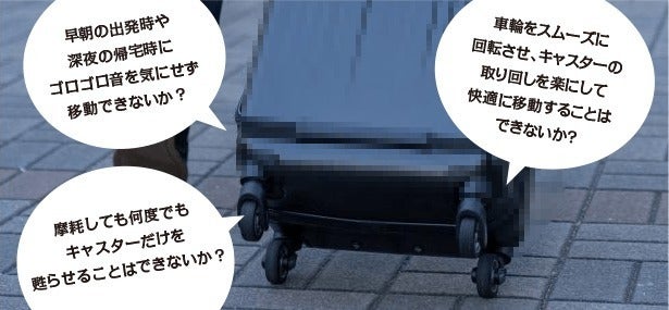 スーツケースの心臓部とも言えるキャスター、破損のリスクや修理の件数の最も多いパーツの一つです。これまでスーツケースを使用していて、キャスターに関する不満やトラブルを抱えた事はありませんか?
