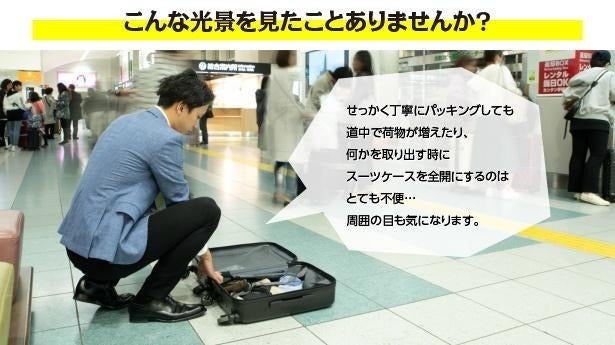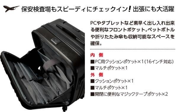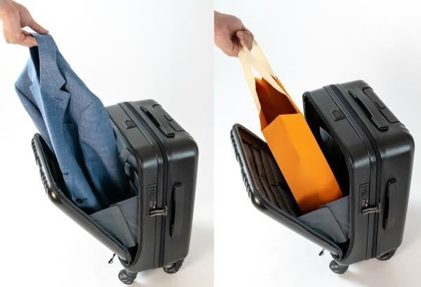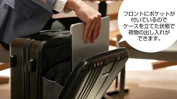 フロントポケット付きのスーツケースは便利ですが従来品には課題もありました。それはスーツケースを開けた際の左側のスペースの一部をポケットとして使用しているため、ポケットの容量の分だけケース内部の収納スペースが減る設計になっていました。