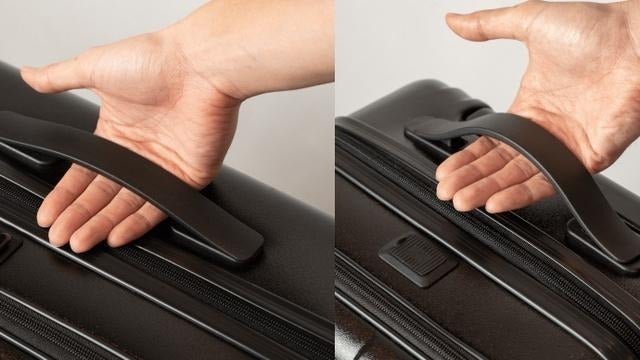 機内持ち込みサイズにはサイドに持ち手が付いてない製品が比較的多く、ケースの上げ下げが不便というお声が多くございましたのでケースのサイドにも持ち手を付けました。フラット式で見た目もシャープ。手を入れても痛くないように十分にマチ幅が広がります。