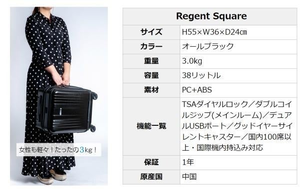 どんなに多機能でも、スーツケースの本体の重量が重いと快適な移動ができません。「Regent Square」は本体の強度を保ちつつ軽量化に成功しました。重量が3kgのため女性でも軽々と持上げる事ができます。