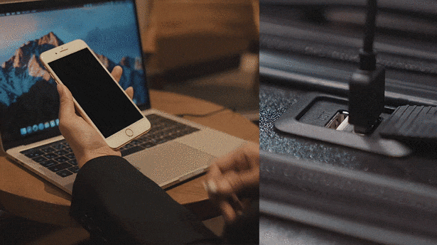 2つのUSBポートを内蔵。ポケットルーム内にUSBポートとモバイルバッテリーを繋ぐケーブルがございますのでそちらにセットしてください。