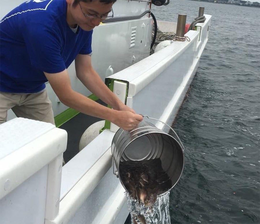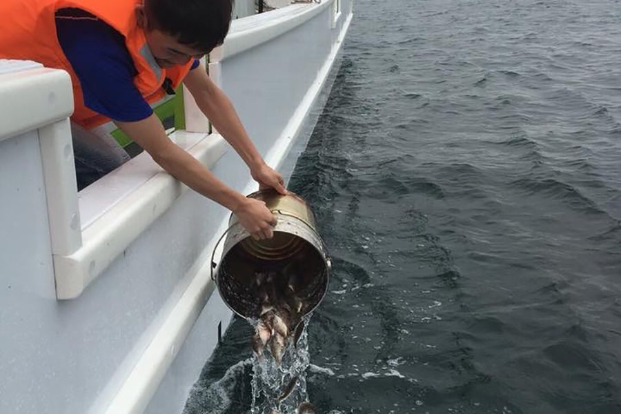 稚魚の放流の様子。昨年はマダイを放流しました。