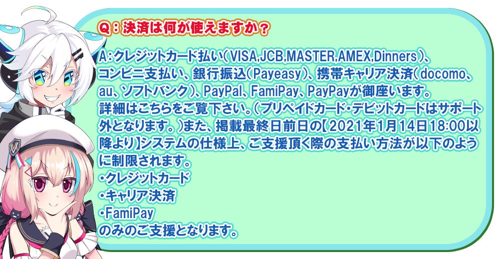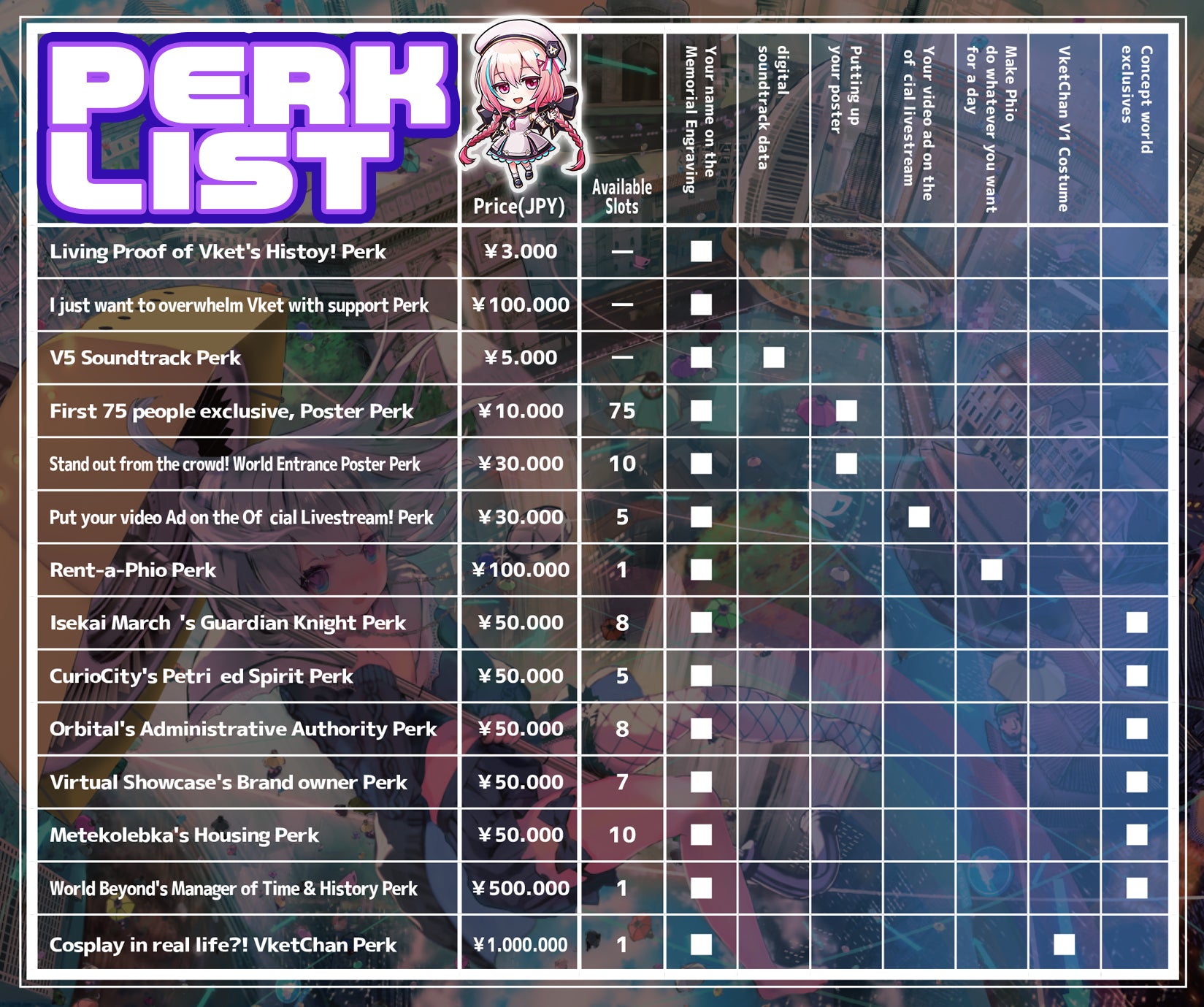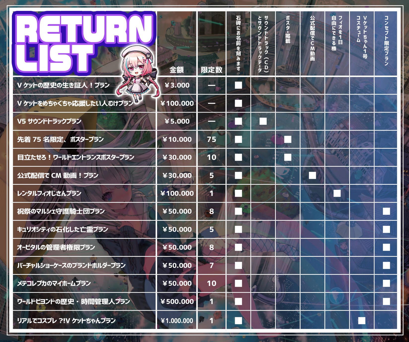 2020/11/26 17:48Due to system specifications, we have not been able to add English translations of the return details for each perk.Please see this article for an English translation of the return details of each perk.システムの仕様上、各プランのリターン詳細の英訳を追記することができませんでした。各プランのリターン詳細の英訳につきましては、この記事をご覧ください。●Living Proof of Vket's Histoy! Perk Vケットの歴史の生き証人!プラン◆We'll engrave your name on the Virtual Market 5's entrance Memorial Engraving.※Please enter the name you want to be engraved on the Specification field. Please "only" enter the name on the field.※If you apply before Nov. 29(JST), your name will be engraved on the memorial at the event. Later applications will be additionally engraved when the venue becomes a Public world.●I just want to overwhelm Vket with support Perk Vケットをめちゃくちゃ応援したい人むけプラン◆We'll Large engrave your name on the Virtual Market 5's entrance Memorial Engraving.※Please enter the name you want to be engraved on the Specification field. Please "only" enter the name on the field.※If you apply before Nov. 29(JST), your name will be engraved on the memorial at the event. Later applications will be additionally engraved when the venue becomes a Public world.●V5 Soundtrack Perk V5サンウンドトラックプラン◆We'll engrave your name on the Virtual Market 5's entrance Memorial Engraving.◆Original soundtrack CD containing the 12 venue BGMs + Digital soundtrack data.※Please enter the name you want to be engraved on the Specification field. Please "only" enter the name on the field.※If you apply before Nov. 29(JST), your name will be engraved on the memorial at the event. Later applications will be additionally engraved when the venue becomes a Public world.※If supporting from overseas, only the soundtrack data will be available.●First 75 people exclusive, Poster Perk 先着75名限定ポスタープラン◆We'll engrave your name on the Virtual Market 5's entrance Memorial Engraving.◆You can put up a poster on Virtual Market 5's venue (except for WorldBeyond and DefaultCube).※This perk is only for individuals and we won't be accepting corporate entities.※The poster image size will be 1448×2048 (pixel) and a vertical png.※If you submit your poster before Nov. 29(JST), your poster will be displayed during the event period. Later submissions will be added to the venues when the venues become Public worlds.※You cannot specify the venue your poster will be.※For optimization reasons, your poster resolution will be lowered.※Please enter the name you want to be engraved on the Specification field. Please "only" enter the name on the field.※If you apply before Nov. 29(JST), your name will be engraved on the memorial at the event. Later applications will be additionally engraved when the venue becomes a Public world.●Stand out from the crowd! World Entrance Poster Perk 目立たせろ!ワールドエントランスポスタープラン◆We'll engrave your name on the Virtual Market 5's entrance Memorial Engraving.◆You can put up your poster on the entrance venue of Virtual Market 5※Both corporates and individuals can apply.※The poster image size will be a 1448x2048(pixel) vertical png.※If you submit your poster before Nov. 29(JST), your poster will be displayed during the event period. Later submissions will be added to the venues when the venues become Public worlds.※You cannot specify the venue your poster will be.※For optimization reasons, your poster resolution will be lowered.※Please enter the name you want to be engraved on the Specification field. Please "only" enter the name on the field.※If you apply before Nov. 29(JST), your name will be engraved on the memorial at the event. Later applications will be additionally engraved when the venue becomes a Public world.●Put your video Ad on the Official Livestream! Perk 公式配信でCM動画!プラン◆We'll engrave your name on the Virtual Market 5's entrance Memorial Engraving.◆Your video ad will be played during Virtual Market 5's official livestream (at least 2 plays are guaranteed).※This perk is only for individuals and we won't be accepting corporate entities※The video must be a horizontal 16:9 mp4, with a maximum of 1920x1080(pixel) and within 30 sec.※The video must be submitted by Dec. 13(JST).※Please enter the name you want to be engraved on the Specification field. Please "only" enter the name on the field.※If you apply before Nov. 29(JST), your name will be engraved on the memorial at the event. Later applications will be additionally engraved when the venue becomes a Public world.●Rent-a-Phio Perk レンタルフィオじさんプラン◆We'll engrave your name on the Virtual Market 5's entrance Memorial Engraving.◆You get to do whatever you want with Phio for a whole day (within reasonable bounds).※The schedule/rental details will be discussed and adjusted via the CAMPFIRE Message after your perk support is confirmed.※Phio: "I'd like this to be the first and last time I'm putting my body on the line."※Please enter the name you want to be engraved on the Specification field. Please "only" enter the name on the field.※If you apply before Nov. 29(JST), your name will be engraved on the memorial at the event. Later applications will be additionally engraved when the venue becomes a Public world.●Isekai Marché's Guardian Knight Perk 祝祭のマルシェ守護騎士団プラン◆We'll engrave your name on the Virtual Market 5's entrance Memorial Engraving.◆Your avatar's screenshot (close-up or bust shot) will be put up on several areas of Isekai Marché: Origin Fiesta as Guardian Knight Portraits.※Both corporates and individuals can apply.※We might make color or trim adjustments to the submitted screenshot when we conve