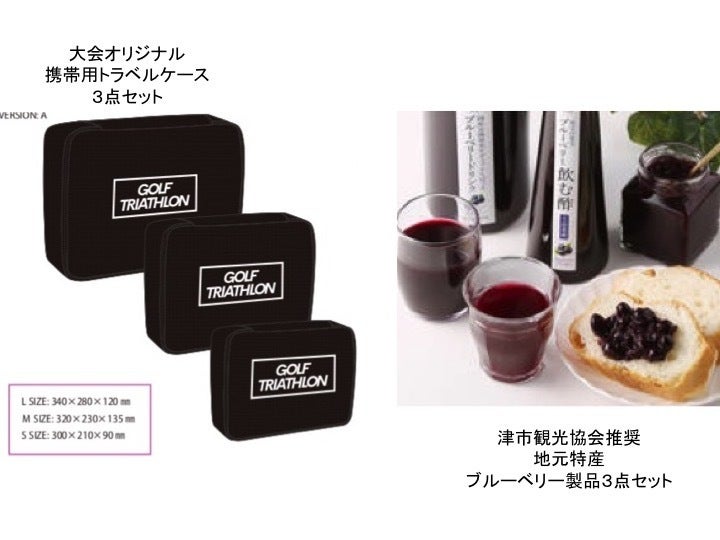 津市観光協会推奨の地元産ブルベリー製品3点セットと大会オリジナルトラベルカバー3点セットをお送りします。トラベルケースもロゴの大きさなどイメージデザインなため、多少の違いがあることをご了承ください。分かり次第すぐにご案内いたします。