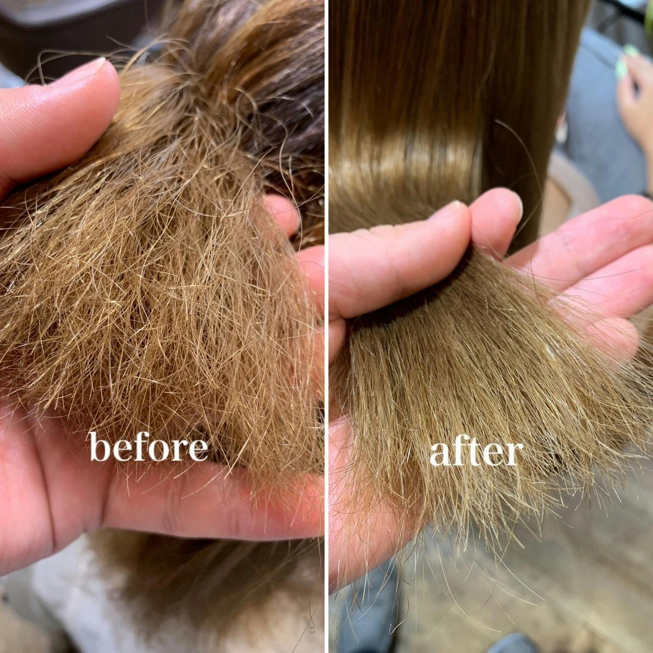 写真は、ブリーチ3回の髪に縮毛矯正をかけたビフォーアフターです。