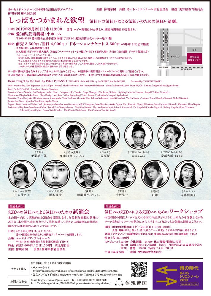 来る2019年9月25日(水)に、愛知県芸術劇場・小ホールにて、あいちトリエンナーレ2019舞台芸術公募プログラム 体現帝国 第八回公演 『しっぽをつかまれた欲望』する運びとなりました。