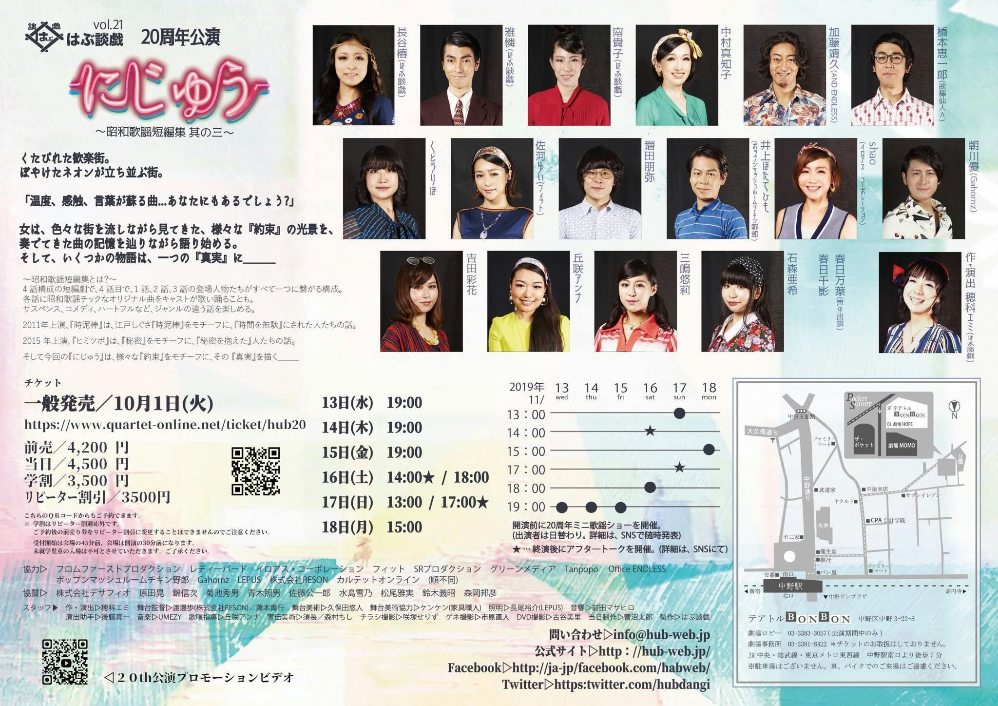 ¥30000→はぶ談戯団員たちのお礼ムービー、クラウドファンディング限定ブロマイド(全員のサイン入り1枚)、20周年特製盃(非売品)、ゲネ写真(ランダム式 1枚)『にじゅう』公演DVD、主題歌CD(非売品版)、チラシデザインのブロマイド(非売品)、当日パンフレットにお名前を記載(任意)
