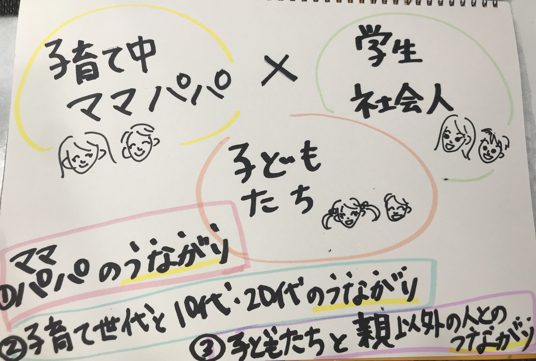 子育てを実際にしているパパ・ママの繋がり、そして子育て世代とこれから子育てをする10代・20代の若者とのつながり、子供たちが、親とは違うお兄さんお姉さんとつながる場としても運営を行っていく予定です。