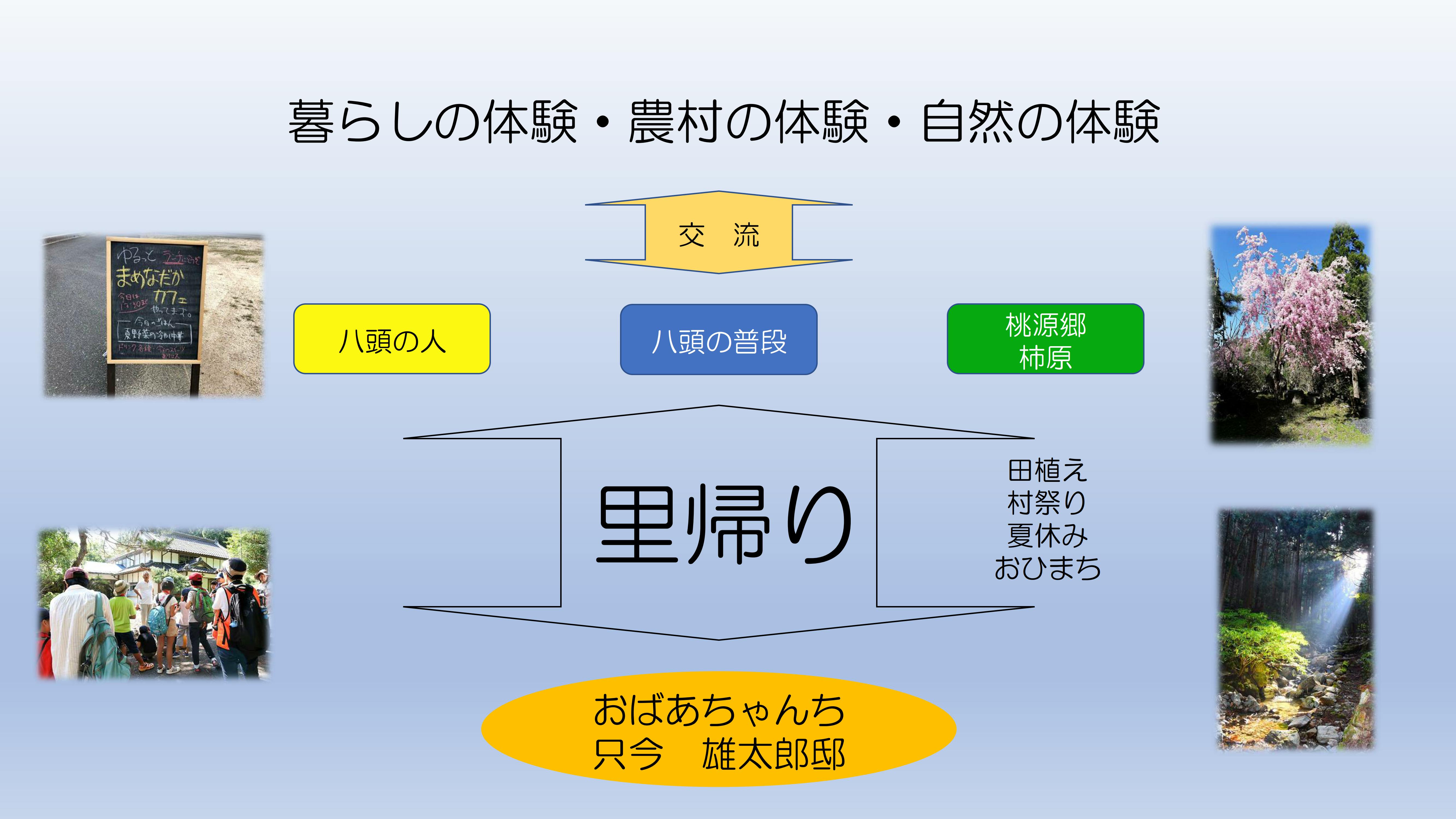 八頭若桜谷は全国の中山間地域同様、少子高齢化・人口流出に歯止めがかからない状況です。もちろん、行政・企業・地域においても様々な移住定住施策を講じていますが、なかなか移住定住までつながらないのが実情です。そこで、県内外の住民を対象に交流人口及び関係人口の増加を目標とした「SATOGAERI」プロジェクトを構想しました。このプロジェクトの目的は弊社事業である交流人口の増加を目標とした「暮らしのツーリズム 八頭若桜谷里山リトリート」や「ふるさとワーキングホリデー」などを通じつながりのできた地域外の皆さんが八頭若桜谷の「関り人」になっていただき、新しい形の地域コミュニティーを再構築し、持続可能な地域再生を目的としています。