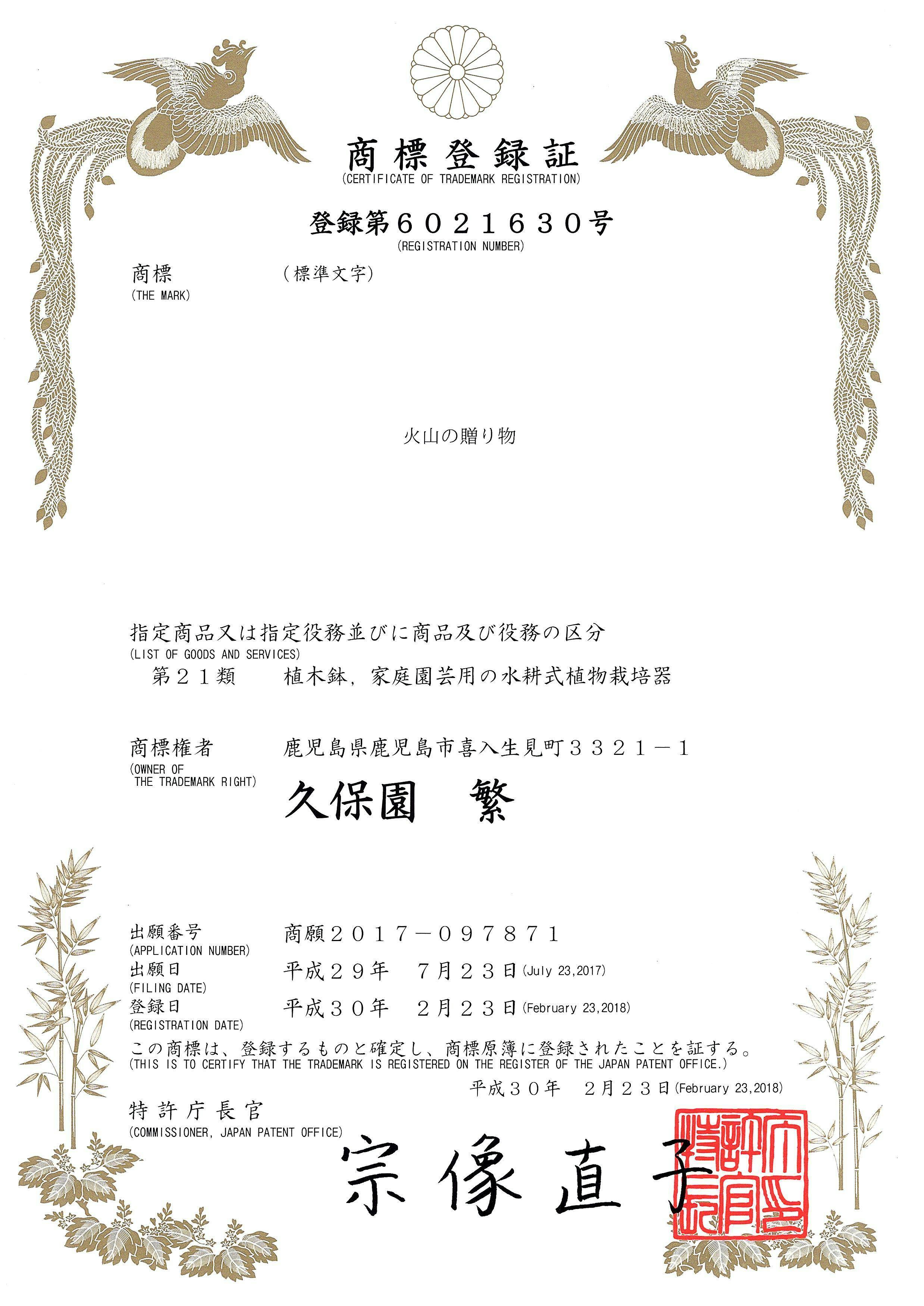 ・「火山の贈り物」は平成30年2月23日に特許庁に商標登録されました。