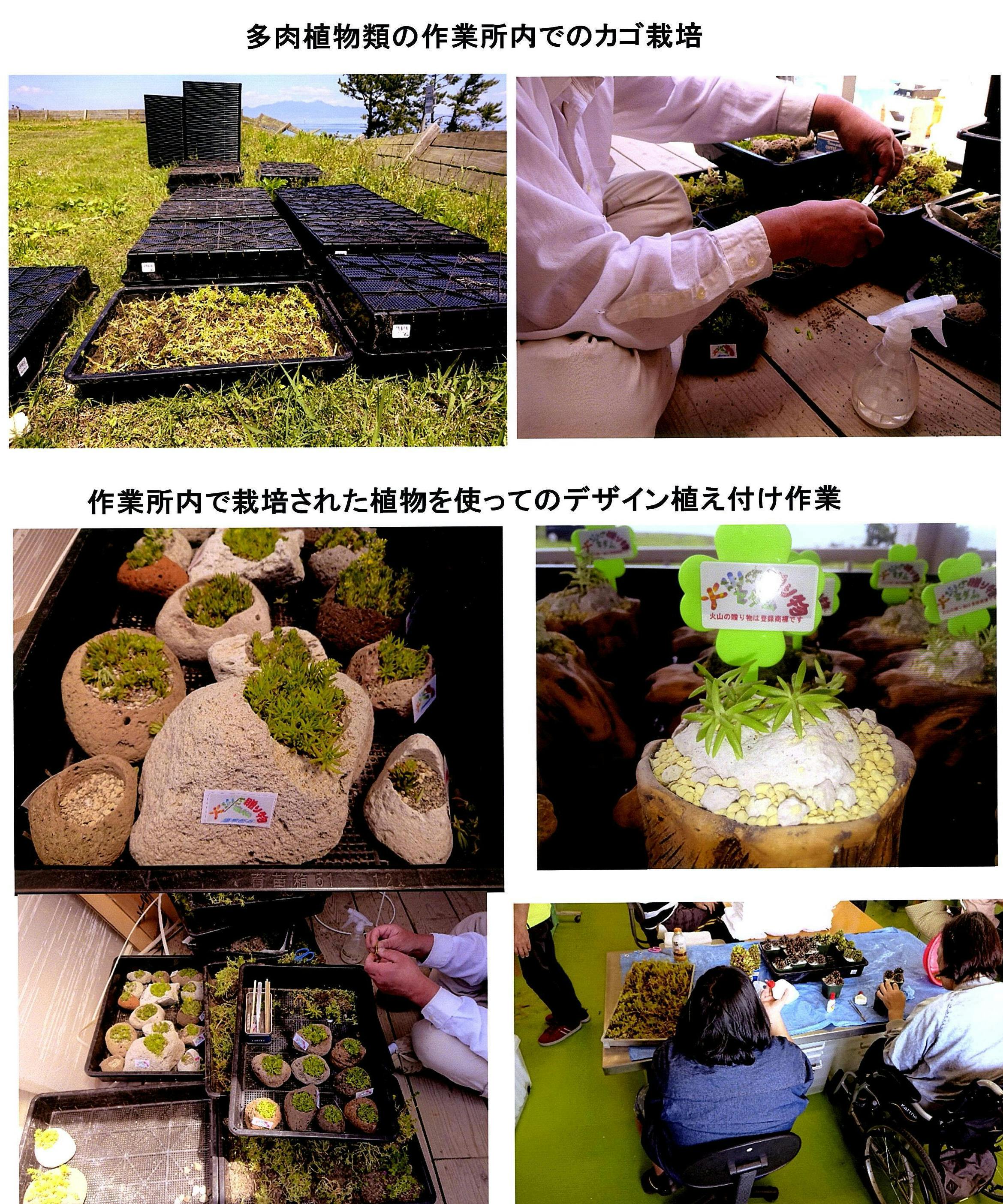 ・平成30年鹿児島県指宿市内の就労継続支援事業所へ多肉植物類の事業所内でのカゴ植栽・生産作業から軽石植木鉢加工植栽・デザイン~販売提案 (作業指導実施)JA観葉植物流通センターとの契約により全国の花市場・植物流通センター等へ試験出荷が可能になりました。