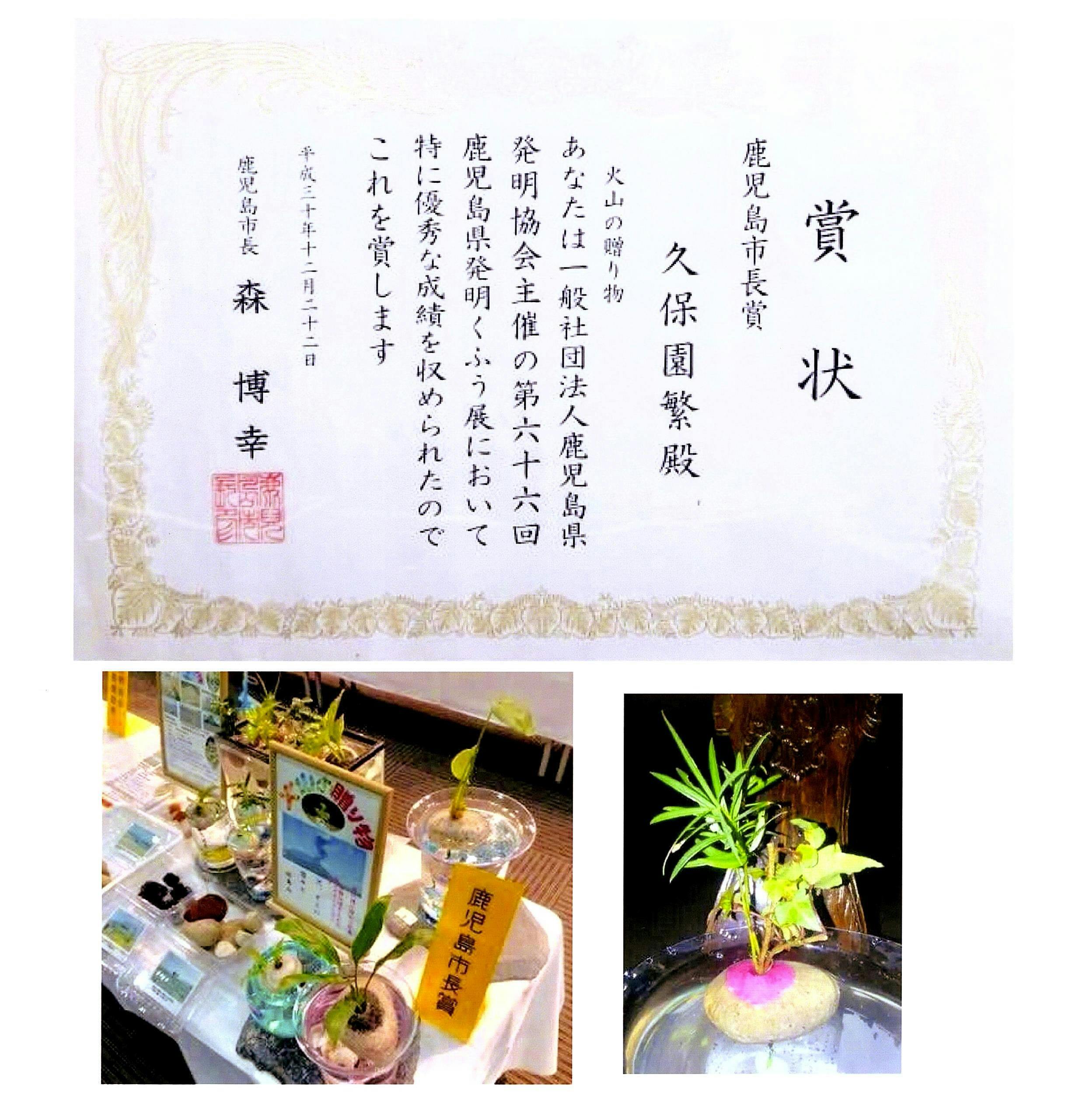 ・「火山の贈り物」水に浮かぶ植木鉢・花瓶(軽石加工作品である水耕栽培器)は、平成30年度鹿児島県発明境界主催の発明創意工夫展に出展・鹿児島市長賞【特賞】を獲得しました。