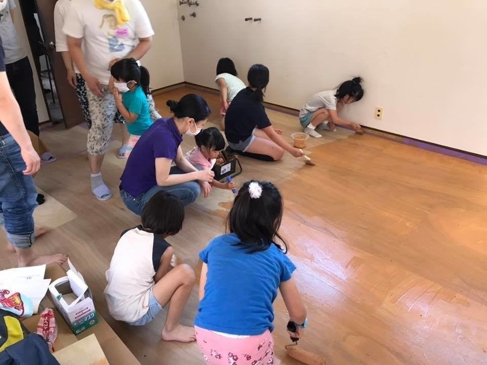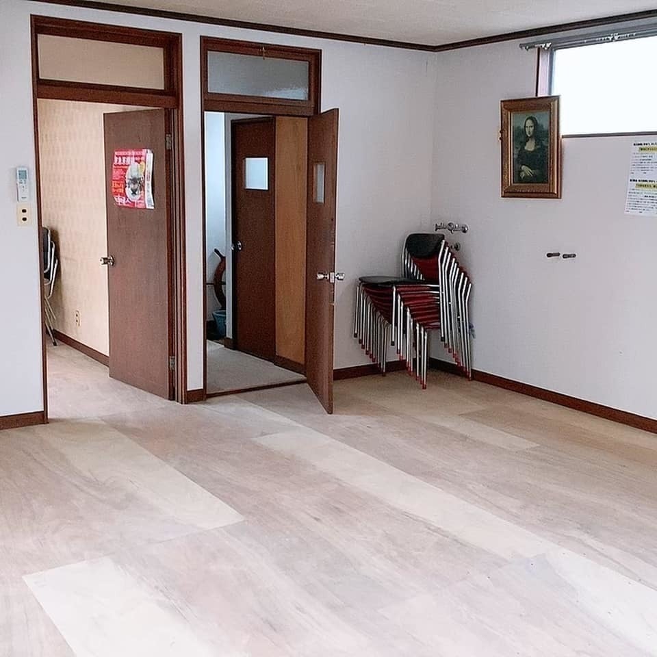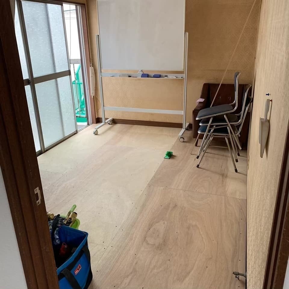 6/16のDIYに向けて二階シェアオフィスの床貼り完了しました!