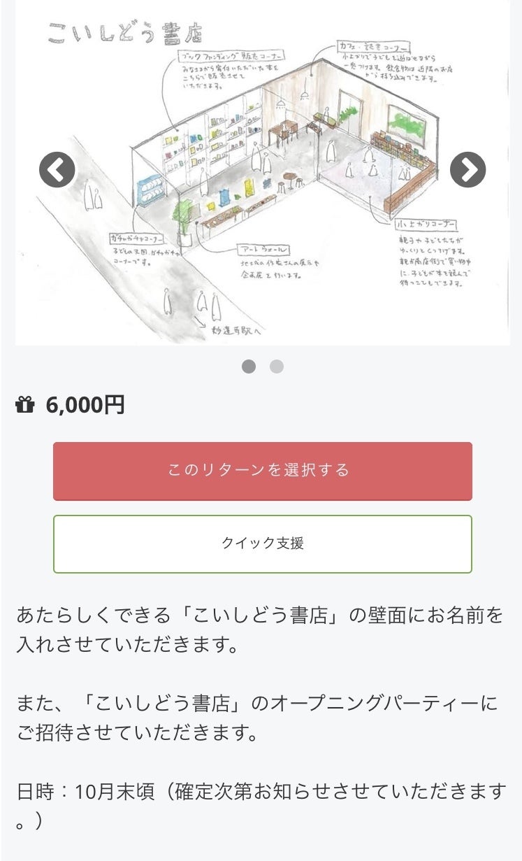 追加リターンとして、「こいしどう書店」への名入れと、オープニングパーティーご招待をご用意しました。