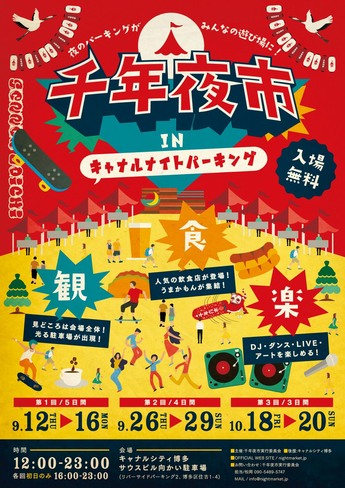2019/09/11 11:24福岡・博多の安心で安全な新しい夜の遊び場を創出する「千年夜市」が!新しく「キャナルナイトパーキング」と題して、DJ、LIVE、ダンス、アート、ポップアップショップ、スケボーランプなど“ストリートカルチャー”をテーマにした期間限定のナイトマーケットを開催します!今度の千年夜市のテーマは「ストリート!」です。ただの駐車場がみんなの遊び場に!?会場は普通のコインパーキング。街での遊び場が少ない昨今、仲間と集まれるような、ファミリーでも来れちゃうような、ありそうでなかった「夜の駐車場を遊び場に。」「ナイトパーキング」とは、今回の会場として使用する場所が、キャナルシテイ博多サウスビル向かいの駐車場であることから名付けました。ただの直訳です(笑)<1st> 9/12〜9/16は、LIVE & DJ &ダンスショーケース<2nd> 9/26〜9/29は、DJパーティ&ダンスショーケースその中でもスケートスクールや、スケボーゲームも開催しています。そしてなんといっても目玉は・・・!<3rd>10/18〜10/20「スケートランプ」が登場します!福岡・今泉にある「LATITUDEスケートショップ」が全面プロデュース。ファミリーでスケートスクールで遊べて、スケボーレンタルも出来るから外国人旅行者とのセッションも楽しめるかも。噂では県外から有名スケーターもゲストで来るとか?詳しい最新情報は 千年夜市の公式instagramにて♪www.instagram.com/sennenyoichi/もちろん会場内では千年夜市名物の“グルメ”も楽しめます。【 飲食参加店 】LOCO COMPANY/ガーリックシュリンプwithえだまめ雲鶏/秘伝のからあげとソーセージ中洲十番/一度食べたらやみつき?ナンサンドLINK/豚バラなどジャンボ串炭屋108/焼き鳥屋さんの鶏料理うまかもん市場 武蔵/激盛り焼きそばむたさんのホルモン焼きそば/自家製ホルモン焼きそばJOURNEY/美味しいお肉のステーキサンド水炊きもつ鍋 八風/水炊き屋の鶏の炭火焼はリピーター続出音楽酒場トレソル/お酒ならなんでもどうぞBARミスターケバブ/本場の味ケバブmunchies/宮崎からオーガニック料理洋風そば食堂 グリチネ/選べる日本酒とめ手羽/名店の手羽先、からあげ満月堂/大人気ハーブチキン、雲仙ハム串炭火焼 吉兆/よく売れてます鶏の炭火焼、焼きそばCafe OTTO シクロ/福岡のカフェ文化コーヒー、タピオカ松きのこの里/農家が育ててお届け、松きのこの天ぷら小梅屋/中洲のラーメン屋の人気メニューからあげ、ポテトKaori’s Grill/スパイス効いたペルー料理肉のうめぜん/肉屋がつくるチキンカツ、牛タン焼肉mighty five star/石窯で焼き上げますLIVEピザたこひら/オールドスクール小ぶりのたこ焼き今回もかなりハイレベルな飲食店街【チカッパ横丁】が登場します!会場の名前「リバーサイドパーキング2」と本当に普通の駐車場なんですけど、キャナルシティ博多の南側を歩いていたら、キャナルの入り口にも提灯が装飾されており、すぐに分かります!そして見どころは?会場全体!千年夜市の提灯が車道沿いにずら〜っとお目見えします!めざせ、光る駐車場!というわけで、清流公園で千年夜市が無い日は、隣の駐車場を煌々と照らしています!それしか出来ませんから!9/12(木)スタート♪ ☆★☆★☆★☆★☆★☆★☆★☆★☆★千年夜市(せんねんよいち) in ナイトパーキング開催日程 全12回①9月12日(木)〜 9月16日(祝・月)②9月26日(木)〜 9月29日(日)③10月18日(金)〜 10月20日(日)開催時間:12:00 – 23:00 (各回初日のみ16:00〜)開催場所:リバーサイドパーキング2(福岡市博多区住吉1-4)入場料金:無料予約:不要主催:千年夜市実行委員会後援:キャナルシティ博多 もっと見る