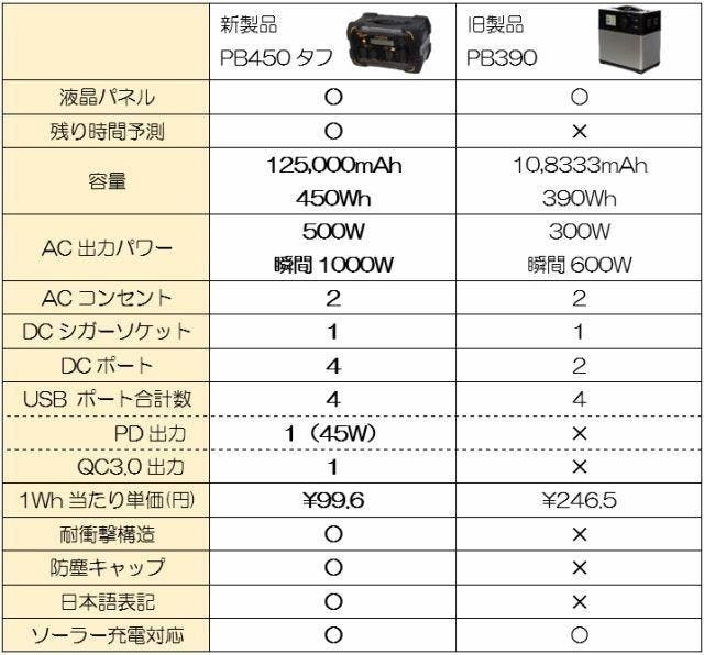 PB450タフは大容量125000mAh(450Wh)です。消費電力10Wの製品ならば最大45時間稼働する能力があります(理論上の計算値であり実際には効率の関係で短くなります)。