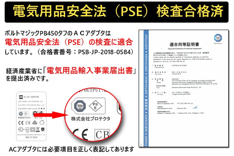 ボルトマジックPB450タフのACアダプタは 電気用品安全法(PSE)の検査に適合 しています。