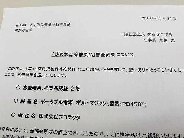 2019/11/27 16:53先日東京で行われました防災用品等推奨品審査会での審査結果が発表され、弊社のボルトマジックPB450タフが「推奨品認証」で合格し、推奨品として認証されました。ご支援くださったパトロンの皆様へ、さらなる安心感をご提供できたと思います。 今後はこの推奨品マークとともに防災関連のイベントなどの出展し、多くの皆様にワイルド電源をご愛用いただけるよう努めて参りますので、今後ともどうぞよろしくお願いします。 もっと見る