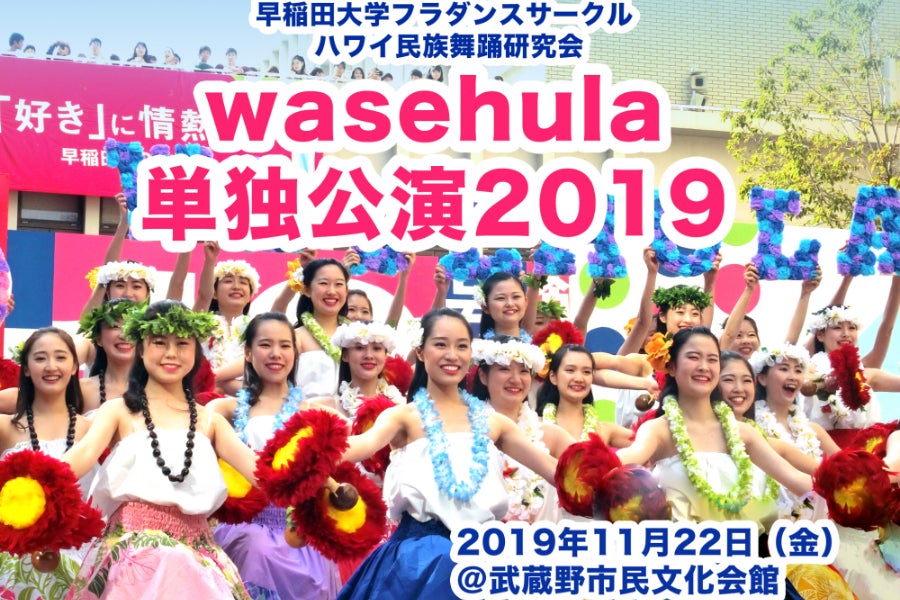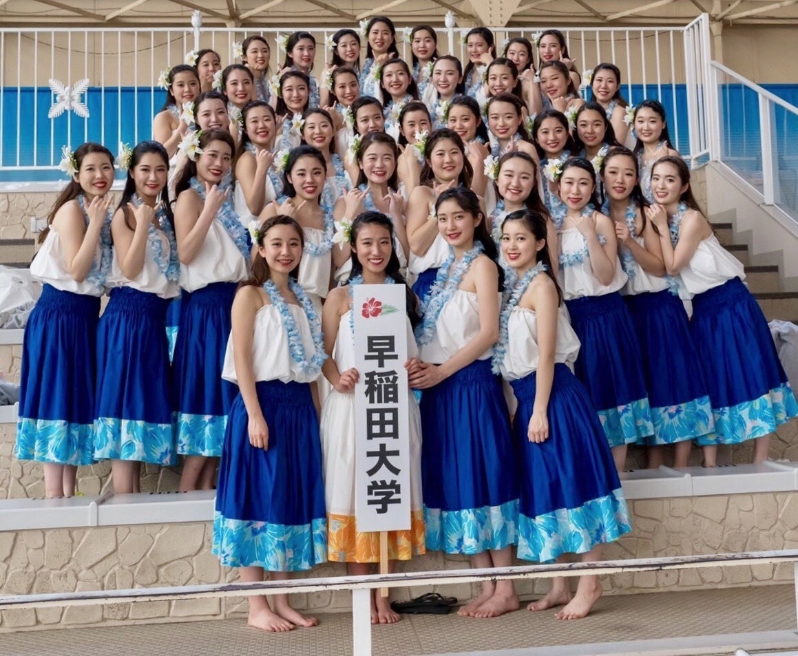 私たちは早稲田大学ハワイ民族舞踊研究会、通称wasehula(わせフラ)です。早稲田大学で唯一の公認フラダンスサークルとして、総勢89人で活動しています。