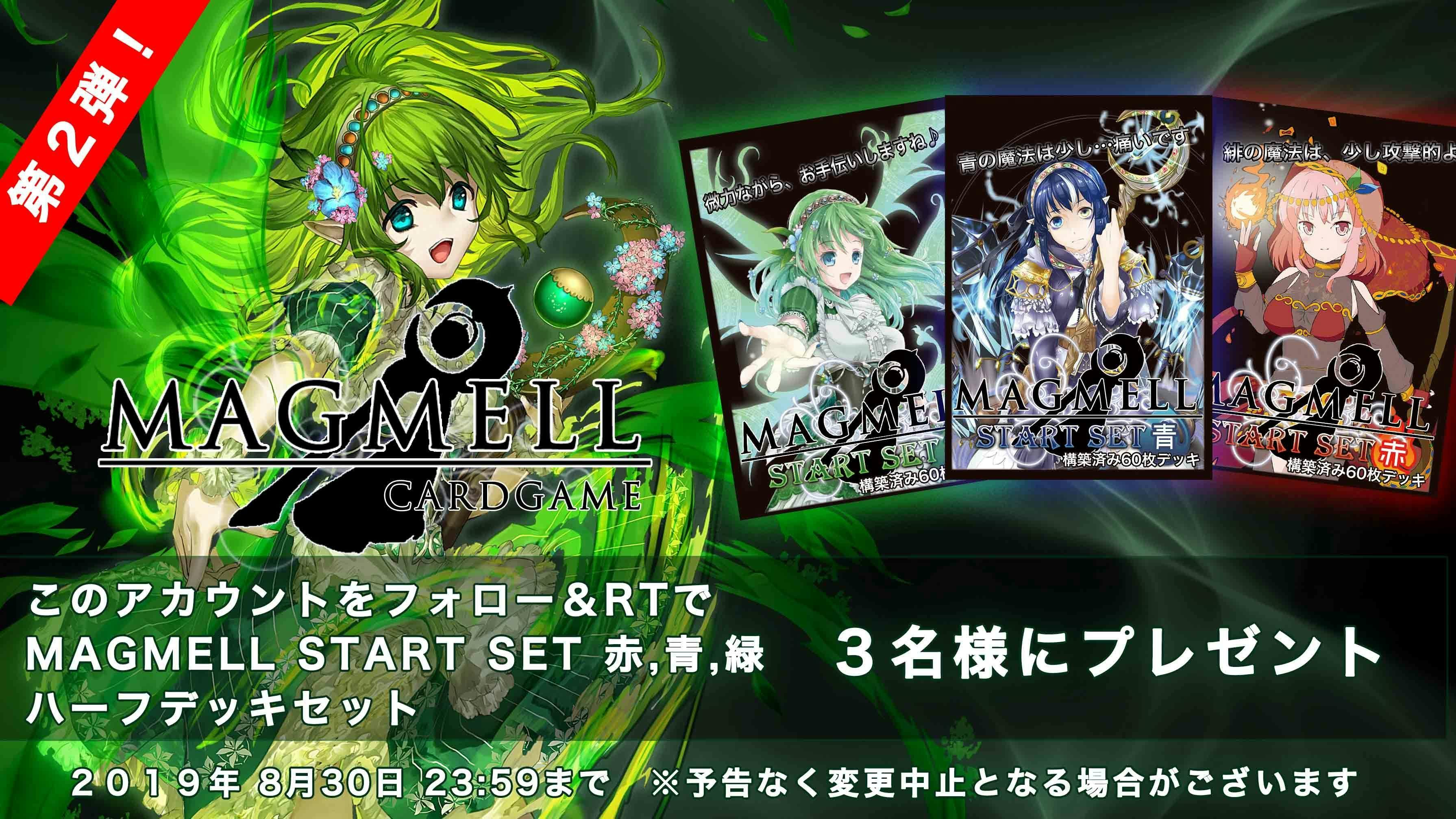 上記アカウントのツィートをフォロー&リツィートして頂いた方の中から抽選で3名様にMAGMELL 赤,青,緑ハーフデッキセットを3名様にプレゼントいたします!