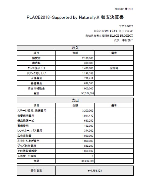 2019/09/24 08:32PLACE2019は天気にも恵まれ、大きなトラブルもなくフィナーレの花火まで終了することが出来ました。皆様にはご支援や拡散など多大なご協力を頂きましたこと、心よりお礼申し上げます。本プロジェクトの目標額には届きませんでしたが、皆様から頂戴した1,360,539円は責任を持って運営費として使用させて頂きます。今後は撤収作業が終了後、随時リターンの準備や収支の報告に移っていきますので引き続き宜しくお願い致します。本当にありがとうございました。また来年お会いできますように。茨城県復興支援団体PLACE PROJECTPLACE実行委員会一同 もっと見る