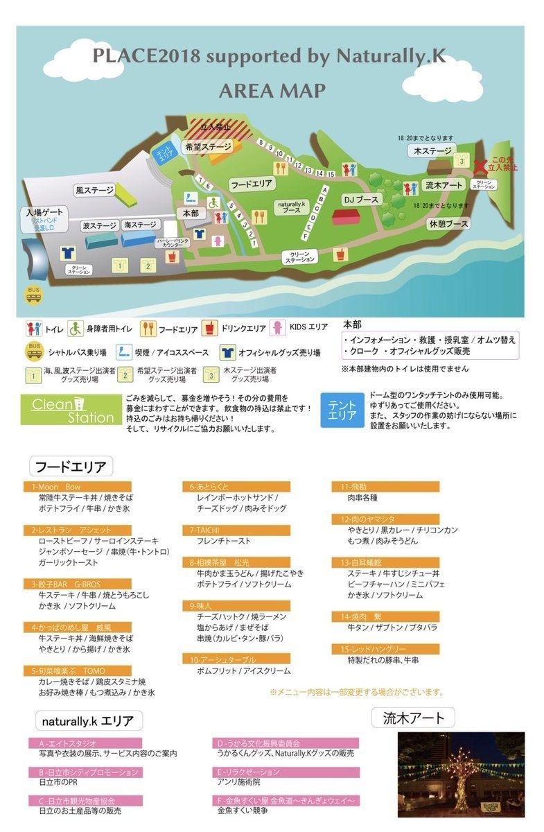 2019/09/19 21:37当日のタイムテーブルやエリアマップ、オフィシャルグッズ、無料シャトルバスの時刻表をお知らせいたします。詳しくは画像をご参照下さい。 PLACE2019 タイムテーブル PLACE2019 エリアマップ・ステージはDJブースを含め全6ヶ所。・KIDSエリアではお子様向けの遊具を無料でご利用いただけるブースも御座います。・飲食で出たゴミは、各クリーンブースへお持ち下さい。・飲食物の持ち込みはお断りしております。・喫煙は所定の場所のみでお願い致します。PLACE2019 オフィシャルグッズ PLACE2019 シャトルバス時刻表 もっと見る