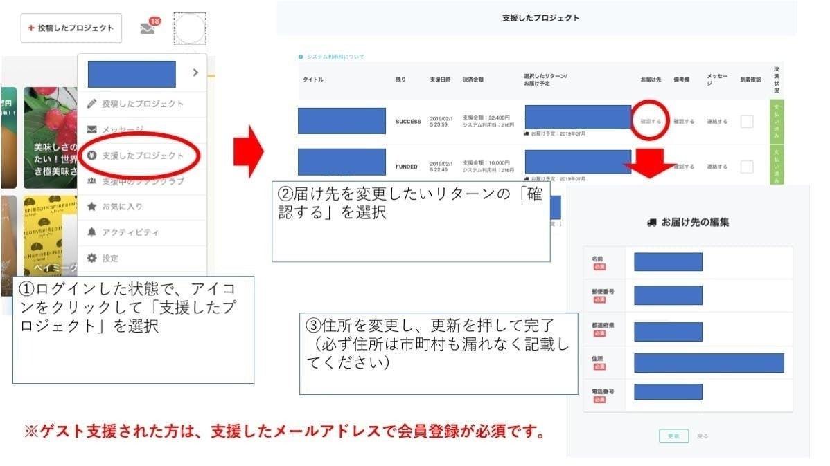 【会員登録が必須です】マイページ内の「支援したプロジェクト」にて「お届け先」→「確認する」より変更可能です。(プロフィールのお届け先情報の変更ではございません。ご注意くださいませ。)※下の画像を参考