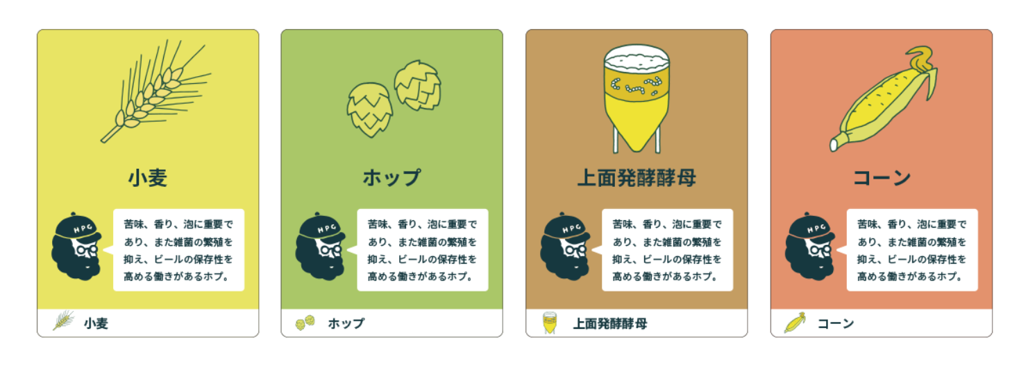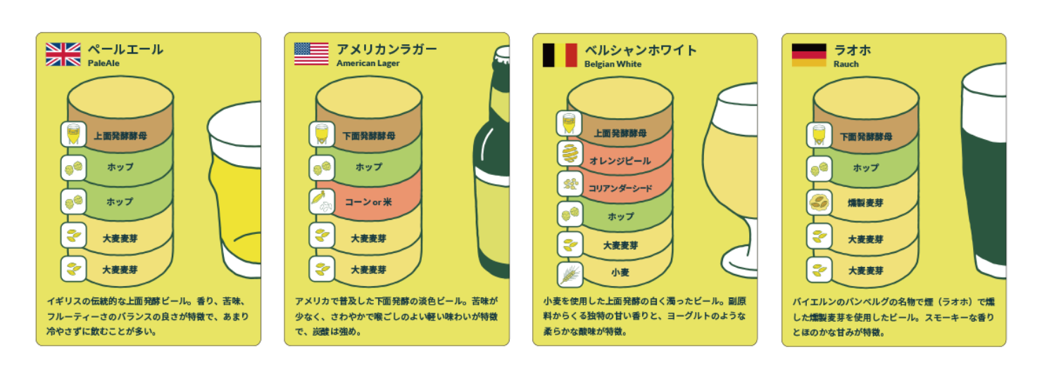 ビールの原料を製造工程通りに集めて完成させていく過程で、全10種類の主要なビアスタイルの味わいや原材料、ビール造りの工程を楽しく学ぶことができます。
