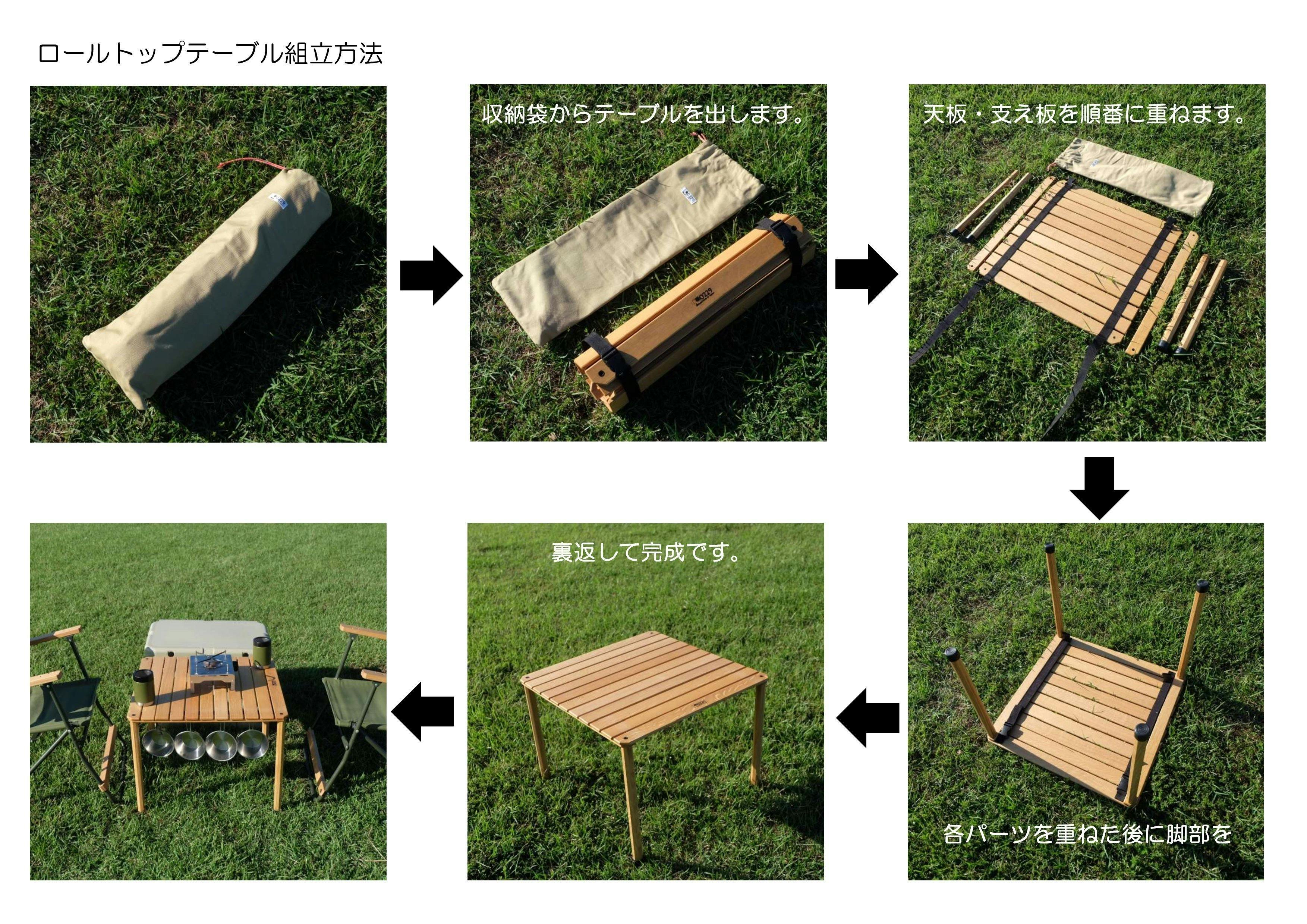 天板を広げ支え板を重ね脚部を回して固定するだけです。収納は天板にパーツをのせくるくる巻きベルトで縛り収納袋へ入れます。