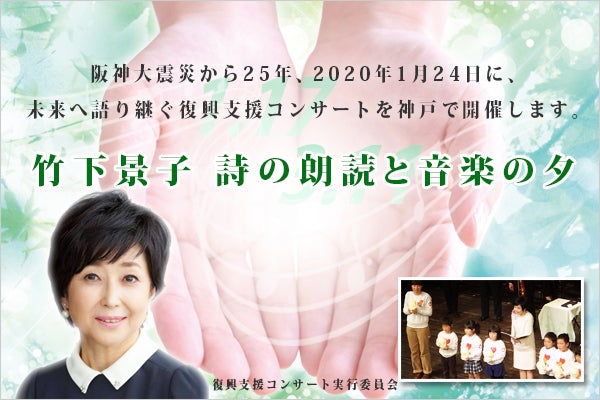 2020年は阪神・淡路大震災から四半世紀になります。復興支援コンサート実行委員会(https://www.roudoku117.com/)は大震災の直後(翌年)から、音楽による被災者の「こころの復興」と被災地域の文化的復活のために活動してきました。そして、震災に関連した全国公募の詩(約4000作の応募)を女優の竹下景子さんが朗読するコンサートを毎年1月に開催しています。