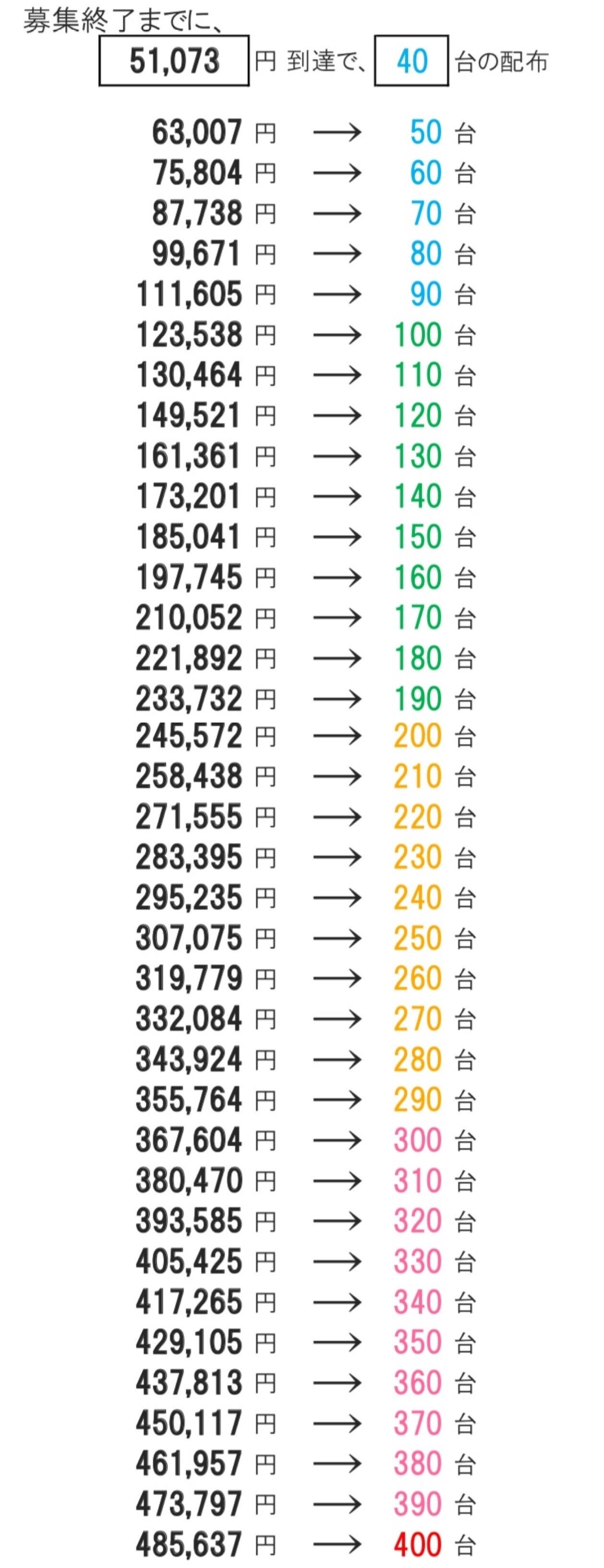 目標金額を越えてからは、支援の額により配布数が増えていきます。