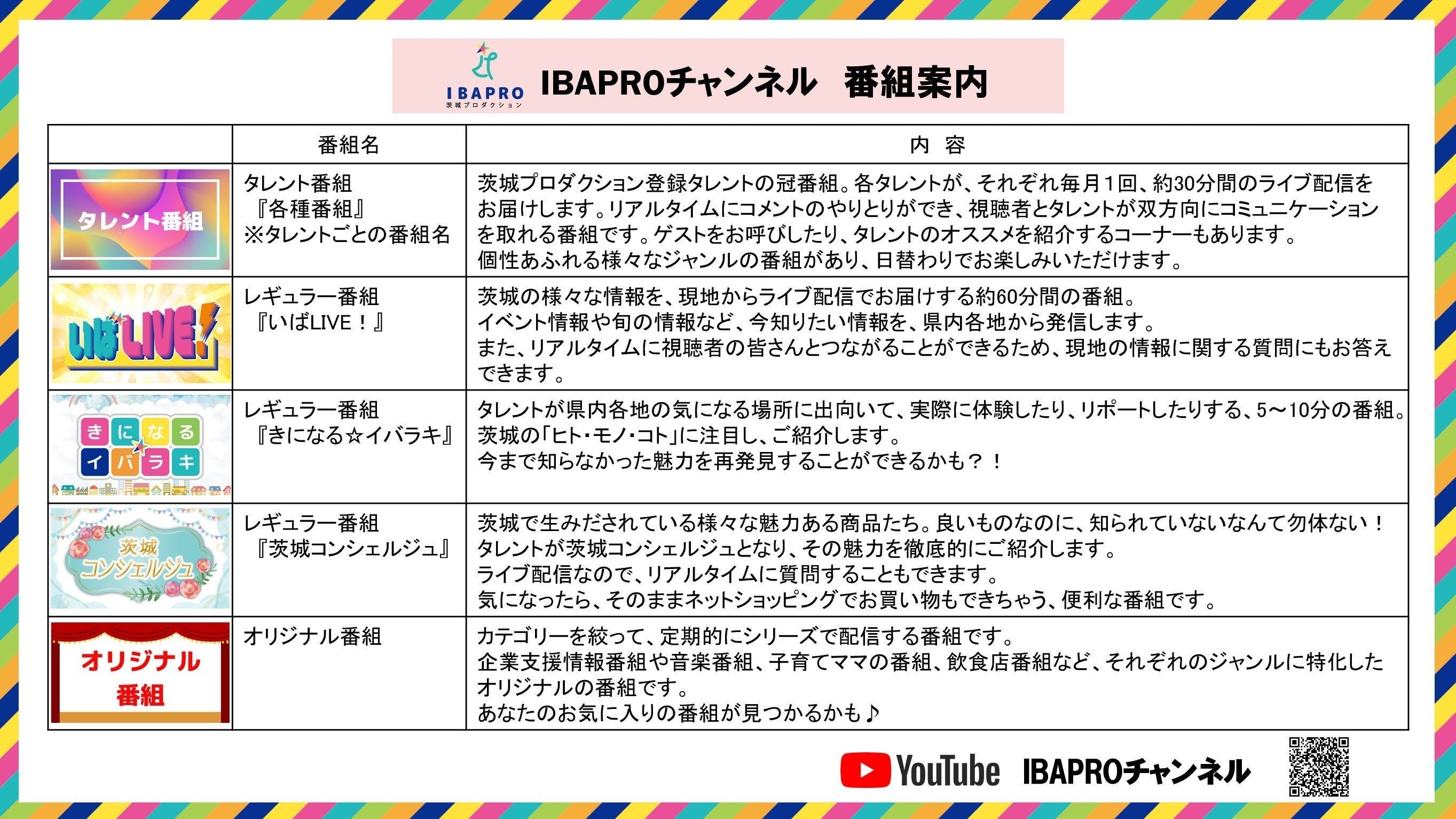 タレントの冠番組や、現地からライブ配信でお届けする『いばLIVE!』、茨城の気になる話題をリポートする『きになる☆イバラキ』、茨城の魅力ある商品を紹介する『茨城コンシェルジュ』、その他各ジャンルに特化したオリジナル番組など、多彩なコンテンツを配信していきます。
