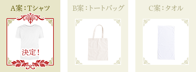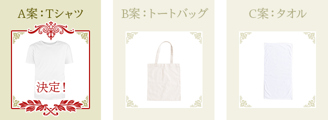 ご投票ありがとうございました。【A案:Tシャツ】に決定しました。グッズには出演者の写真や、番組ロゴがプリントされます。