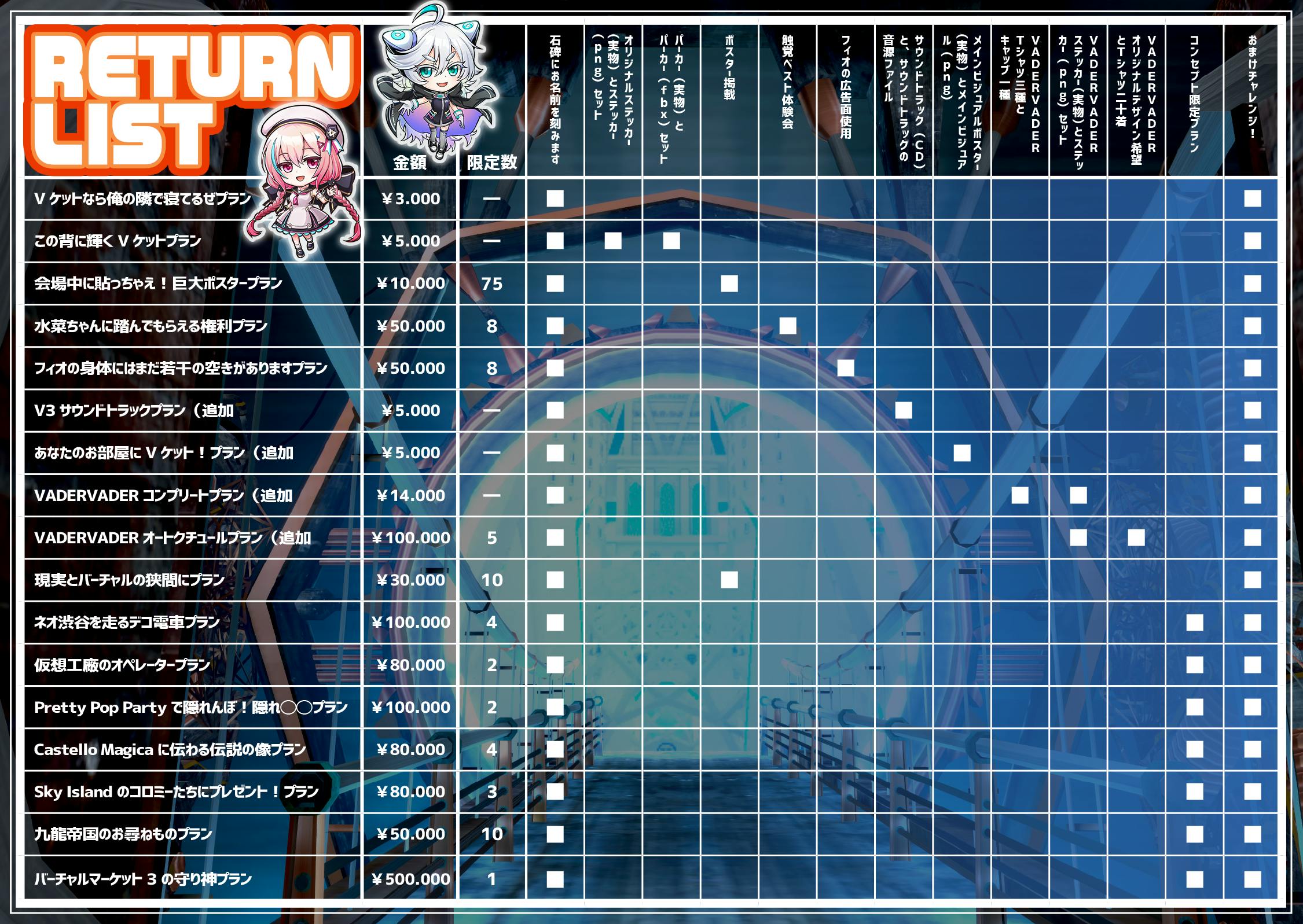 更にバーチャルマーケット3を盛り上げるために、四つの追加プランと、更なるストレッチゴールをご用意いたしました!
