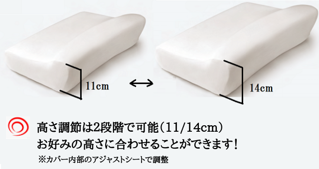 A:製品はまくらカバーの内部にアジャストシートが入った状態で納品されます。このときの高さは14cmです。そのアジャストシートを取り外すことで高さ11cmとなります。取付・取外しは簡単に行うことができます。