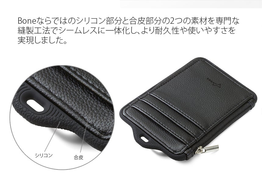 シリコン製品のスペシャリストであるBoneだから実現できました。財布のメイン部分が環境に優しい合皮素材、縁部分とストラップ部分は耐久性、利便性でシリコン素材になっております。