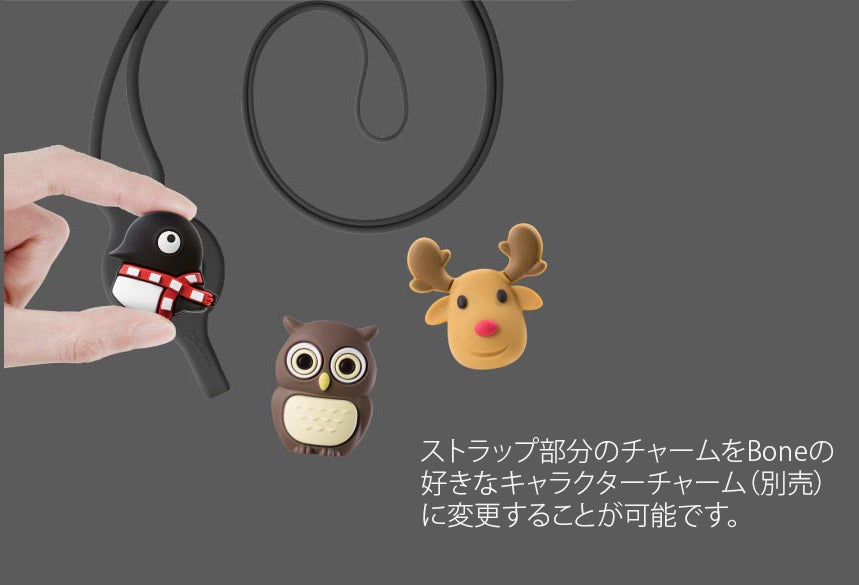 ストラップ部分の円形のチャームは着脱可能で、別売のBoneのキャラクターチャームを取り付けることが可能です。