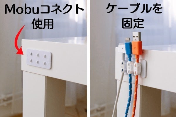 まずMobuコネクトをデスクの側面等に設置し、そこにMobuを取り付けたケーブルを固定します。
