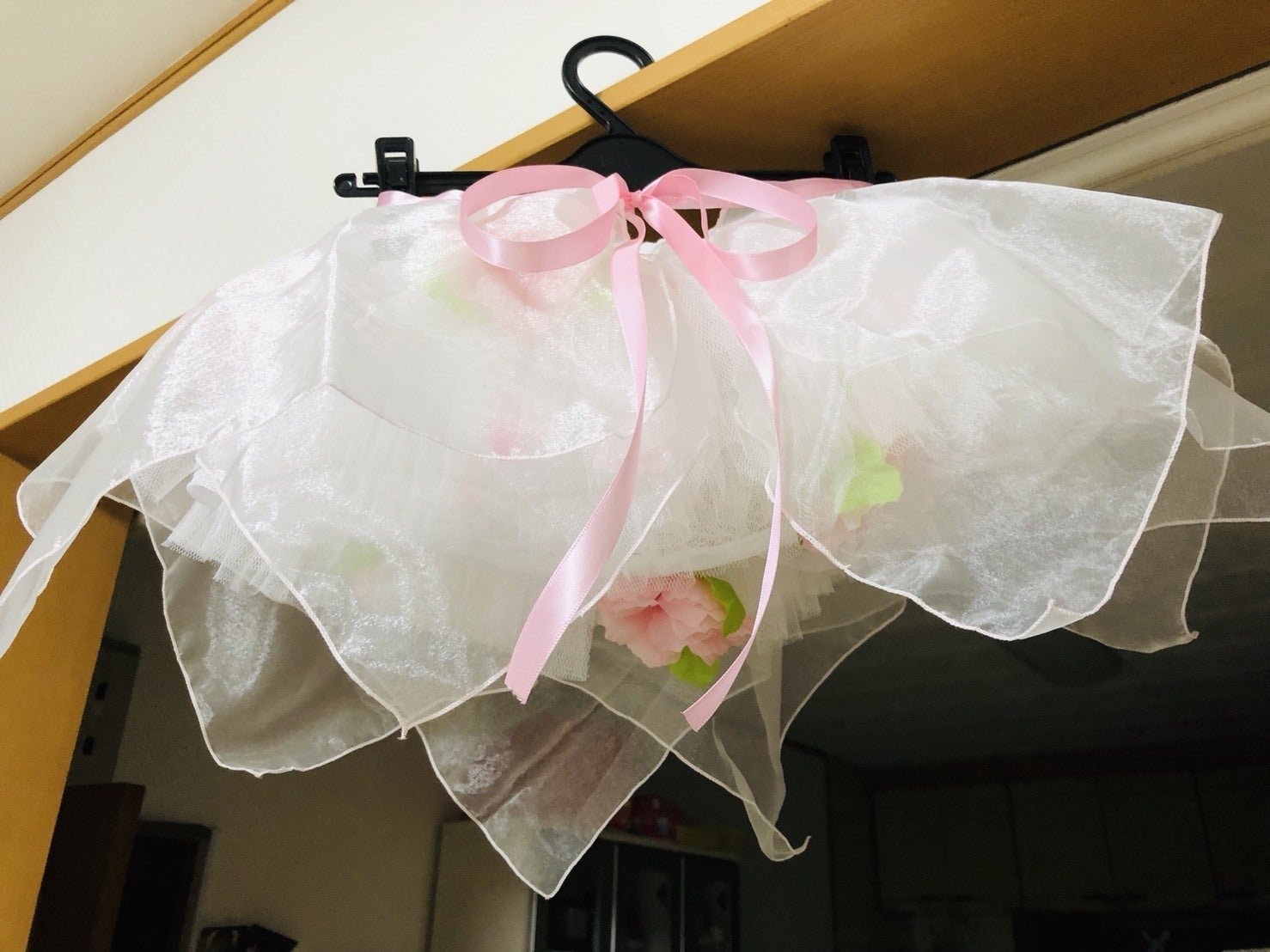 前回のピンクのお花付きペチコートに花びらをイメージした白のオーガンジーをかぶせました。オーガンジーは取り外すとカジュアルスタイルになり、オーガンジーをかぶせることによりフォーマルスタイルにできます。イベント当日はちびっ子達に妖精になってもらって、パパとママと思い出の写真を撮るキッカケになってくれるようなコンテンツを目指してます!こちらはまだ試作品なので、オーガンジーも来月、日暮里で探してきます。フラワーイベントをお楽しみに!チャオ☆〜(ゝ。∂)