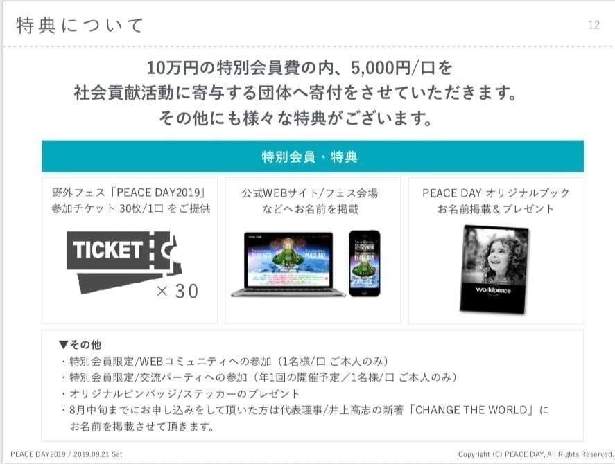 世界をもっとLOVE AND PEACEに!という考えにご賛同いただける方は、ぜひご加入いただきたいピースデーの特別会員権(10万円)。9月21日のピースデーにもぜひご参加を。また、2019年11月末までに参加予定の全ての地球音楽食祭イベントにお越しいただけます(相談会除く)。