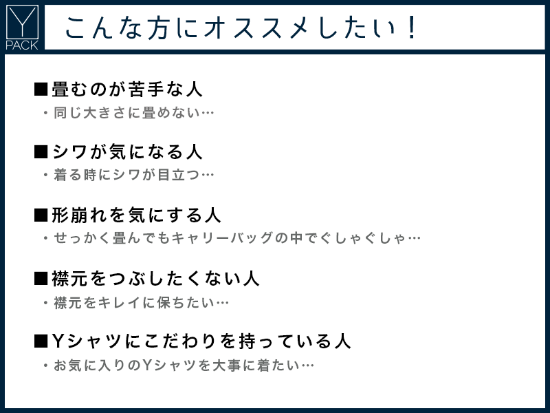「Y-PACK」は「上手にたためない」「しわができる」「襟つぶれ」「型崩れする」