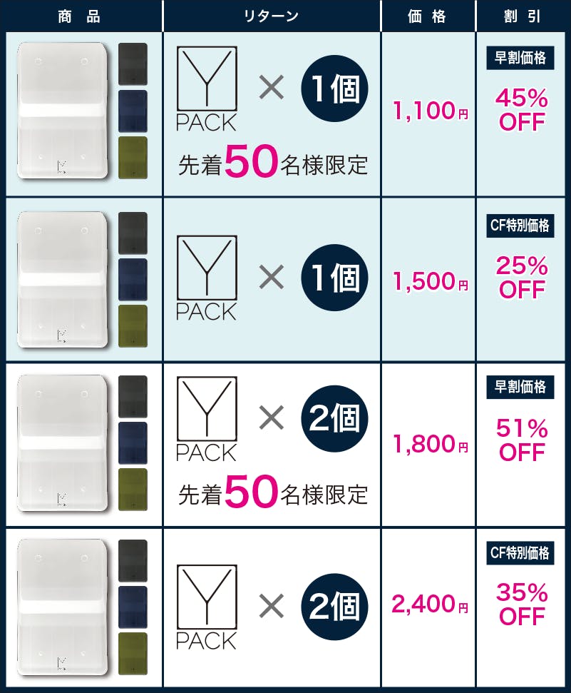 2020/01/08 13:40あけましておめでとうございます。ご支援いただき誠に有難うございます。一人一人のご支援がとても大切なものとなります。今回、ワンコイン支援の要望がありましたので500円リターンを追加させて頂きました。今回の『Y-PACK』は出張が多いサラリーマンの方向けとなっていますが出張しないけどこのプロジェクトにいいなと思って下さる方のためにこの500円リターンを追加しましたので、ただただ応援するよって方がいらっしゃるのならこちらをご利用ください。とても励みとなります!宜しくお願い致します。※支援いただいた方には、CF掲載終了後にお礼のメール送らさせて頂きます。 もっと見る