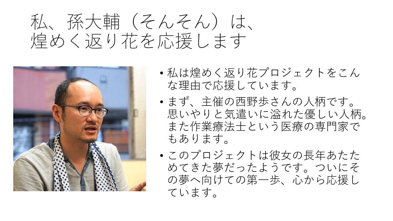 NPO煌めく返り花の代表西野が、高齢者が入れるシェアハウスの夢は持っているけれども、どうしたら実現できるのか、うじうじ考えていた時に、孫大輔さん率いる一般社団法人みんくるプロデュース主催のみんくるカフェファシリテーター講座に参加したのが最初の出会いでした。