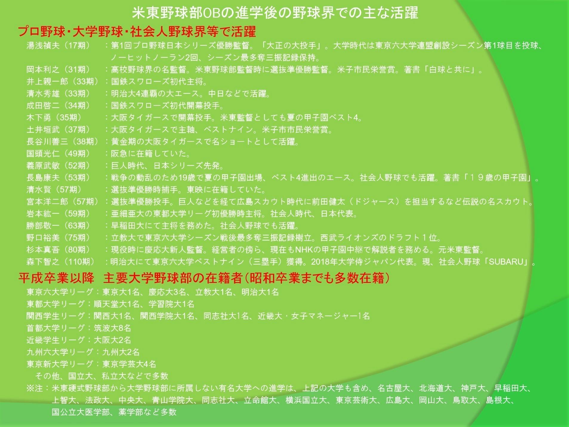 現在の野球部員は地域の野球普及活動のため、定期的に保育園や学童保育施設を訪れたり、学童野球チームとの合同練習を行ったり、地域貢献として子ども達との交流も大切に続けてきました。平成30年の野球科学研究会 第六回大会においては野球部員を含む生徒が研究発表「表情や姿勢及び言動とパフォーマンスとの関係性について」、「ゴロを打ては正しいのか」を発表し、「大会特別新人賞」を受賞しました。これは「日本一を目指す野球部員として地域に誇りと幸せと感動を提供し米東野球を通じて社会貢献を行う」という野球部の理念の下に生徒たちが自ら考えて行っている活動の一部であります。