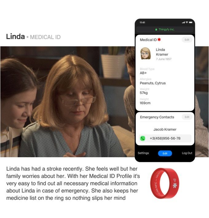 Lindaさんは、最近、脳卒中を患いました。すっかり元気になりましたが、家族は心配しています。緊急事態のとき、NXT Ringの医療情報プロファイルにアクセスすれば、必要な医療情報を簡単に読み出すことができます。Lindaさんは、NXT Ringの中に飲むべき薬のリストを入れていて、飲むのを忘れないようにしています。